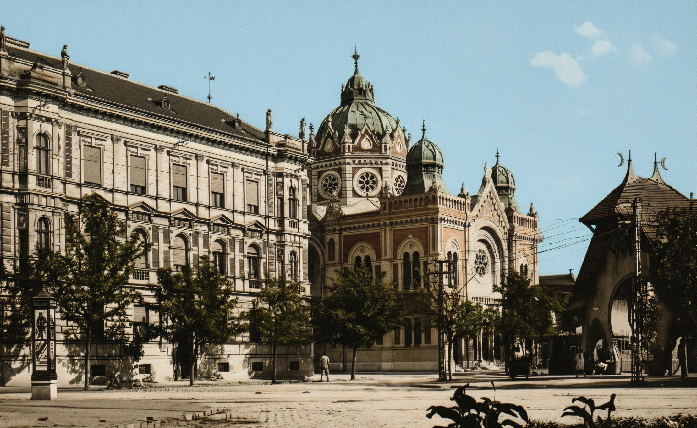 sunny day from east more hyperlight cinematic realistic rendering beautyful clouds 1900 s style dressing people remove text from the picture paved road warm color stucco fassades