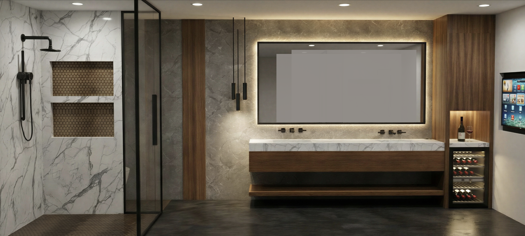 a luxury hotel room bathroom high end materials recessed can lighting is perfectly illuminating the space the mirror is reflecting a crisp painted white wall with a door behind the mirror the led lights glow the shower door is a nice clear glass so you can clearly see the high end tile behind the door behind the vanity is a luxury grey marble and a strip of wood the wood has a slight copper tone to it the rest of the walls are painted a crisp white