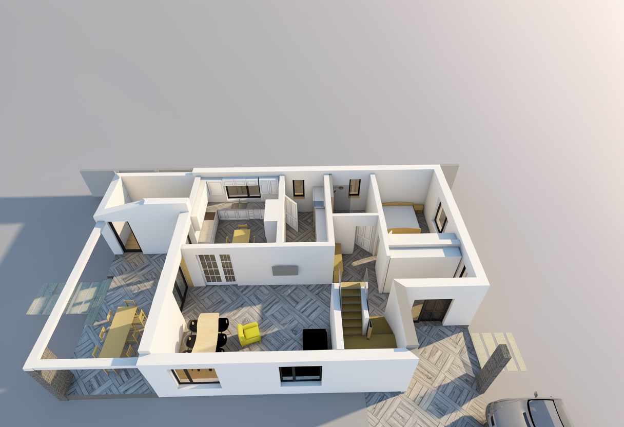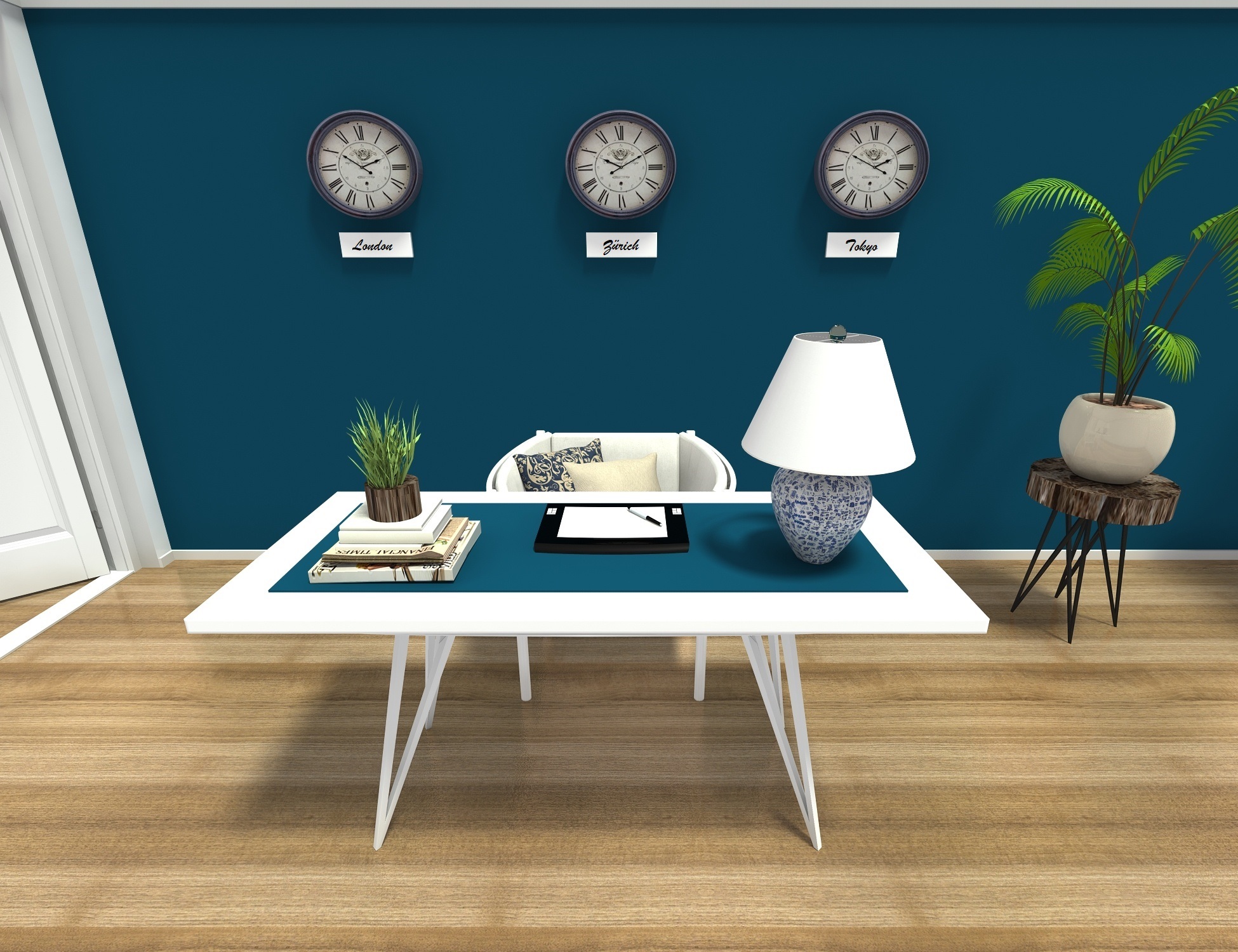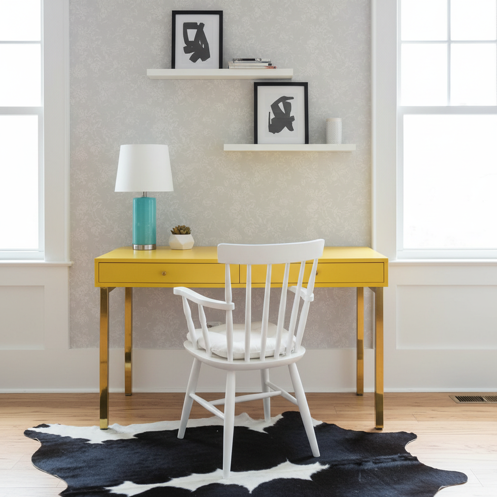 the image shows a modern workspace with a bold and playful color composition the central element of the space is a bright yellow desk that immediately draws attention and functions as a strong visual statement piece the yellow tone is warm and energetic standing out against the otherwise neutral setting complementing it are turquoise or mint green accents visible in the desk lamp and the cylindrical pencil holder which introduce a fresh atmosphere with a subtle retro undertone the rest of the space is grounded in white and light gray tones on the walls and chair while the natural wooden floor adds warmth and balances the intensity of the colorful accents a black and white cowhide pattern rug further enhances the visual contrast and dynamism of the room the materials appear to include painted wood or mdf for the desk and shelves finished with a smooth matte surface the desk legs are metallic with a glossy gold finish adding a touch of glamour and subtle luxury to the composition the chair is wooden and painted white featuring a classic spindle back design that references traditional furniture forms yet is integrated into a contemporary setting the flooring is natural wood with visible grain texture contributing to the organic quality of the space the rug has a soft textile surface with irregular organic edges the wall shelves are minimalist color coordinated with the desk and finished in a uniform smooth surface pattern plays an important role in the room s visual identity the most prominent pattern is the high contrast black and white cowhide motif of the rug characterized by its organic irregular shapes the side walls feature a subtle floral pattern in light tones decorative yet restrained ensuring that it does not overpower the bold central desk framed artworks displayed on the shelves add additional visual interest mostly in black and white helping to maintain balance within the vibrant composition overall the style can be described as eclectic with elements of contemporary minimalism and hints of scandinavian simplicity combined with a bold almost pop art inspired color gesture the interplay of clean geometry strong color accents and contrasting textures creates a space that feels creative energetic and slightly playful while remaining organized and functional as a working environment architecture