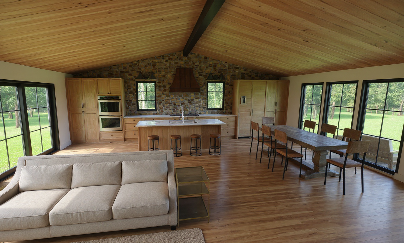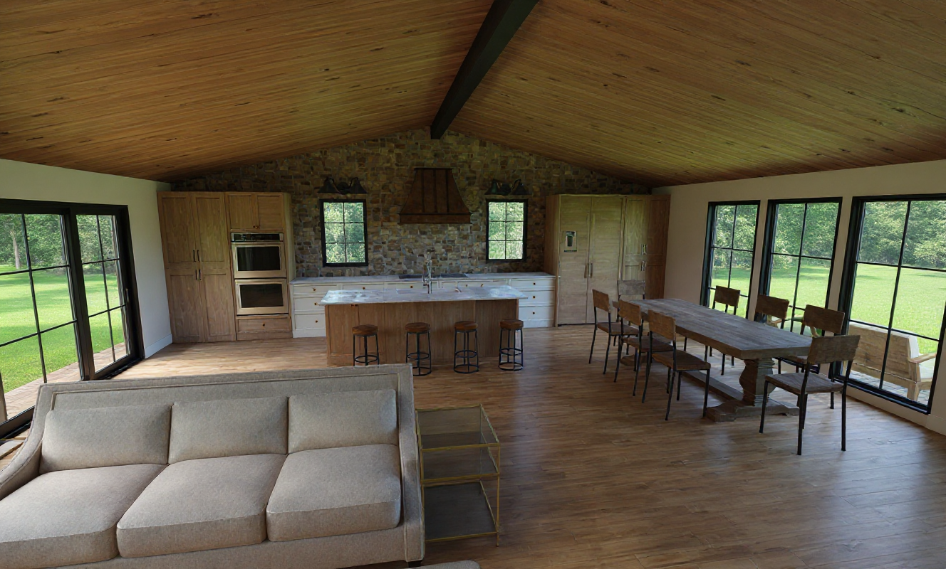 modern farm house interior view from kitchen look to the fireplace architecture