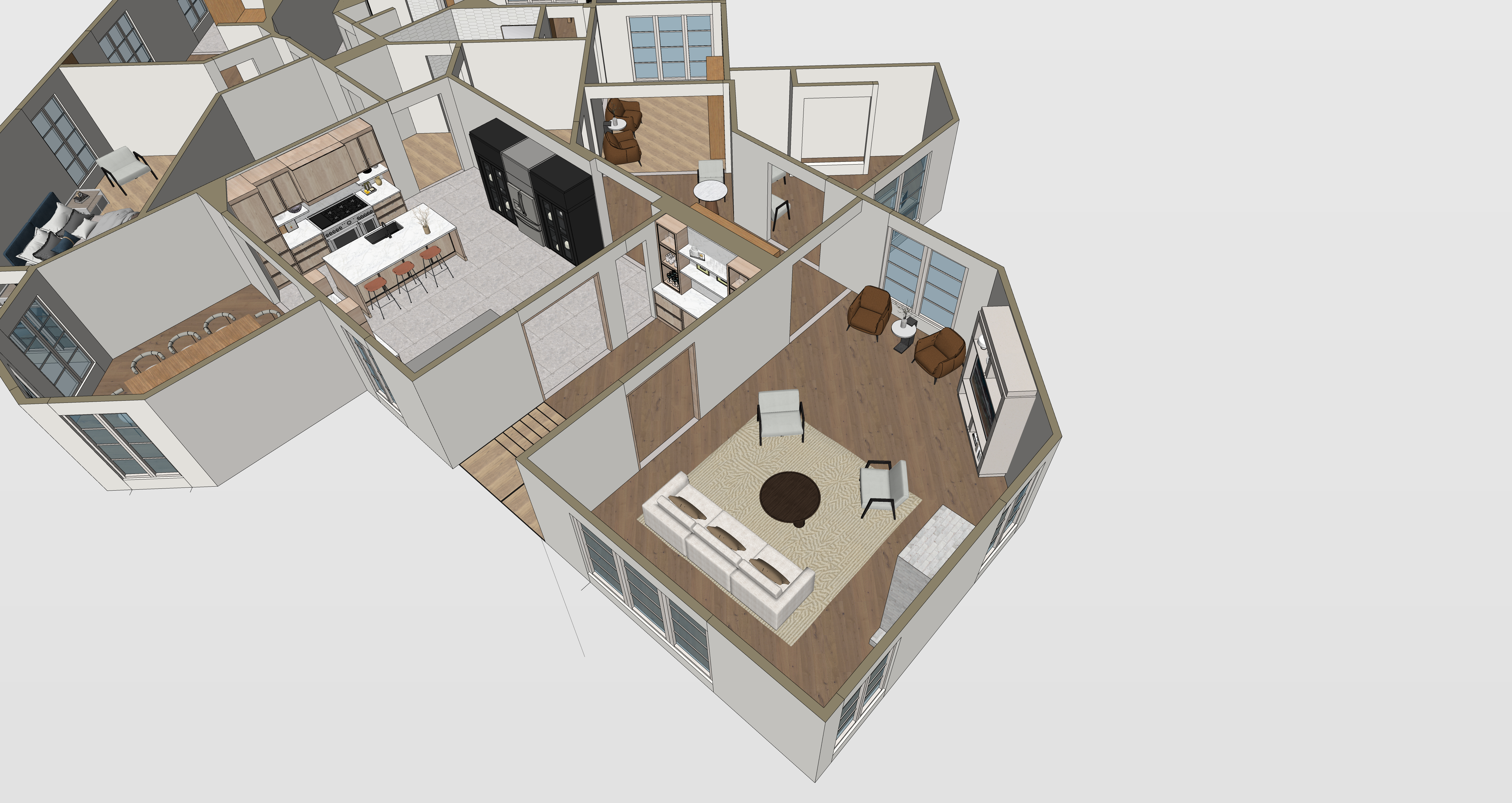 take this cad floor plan and turn it into a rustic mountain vibe home with large wooden bems for cased openings and vertical shiplap walls painted white