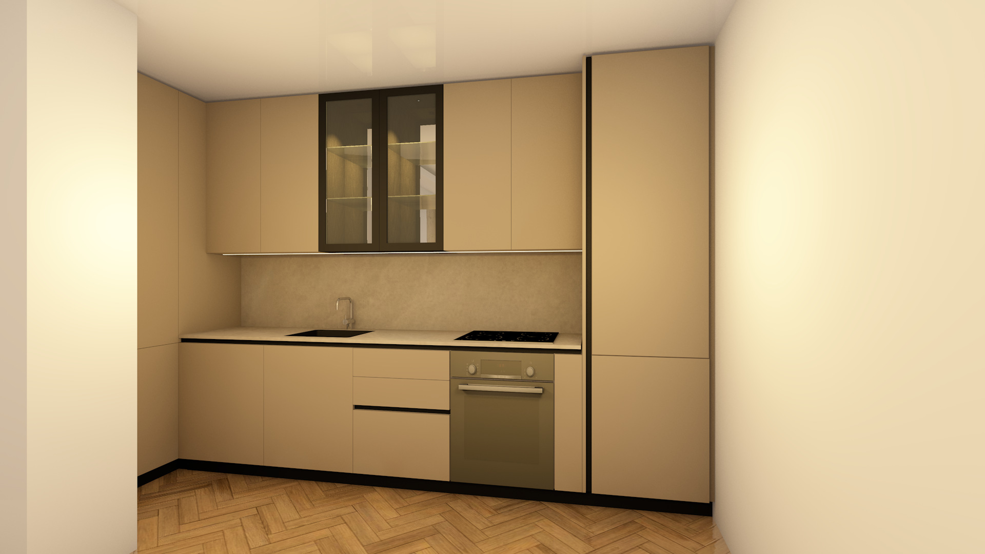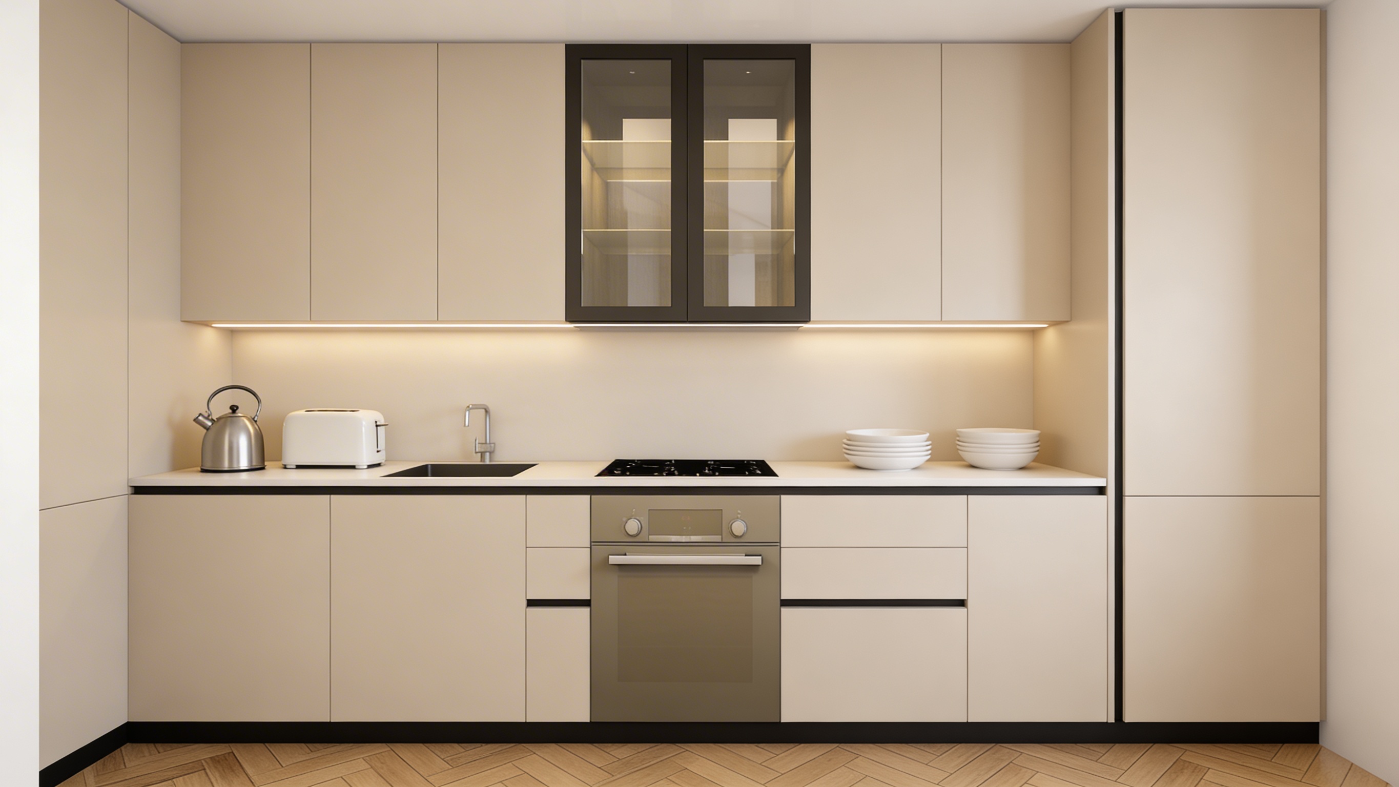 minimalist soft colors add led lights and kitchen accessories add glasses on the glass cabinets