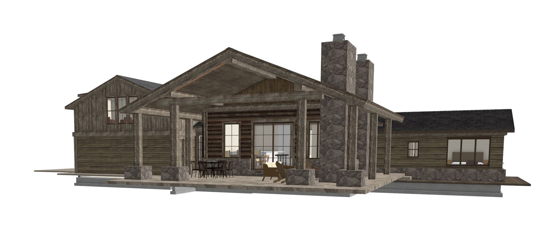 grainy watercolor render of timber frame building with reclaimed wood siding and stone wainscot