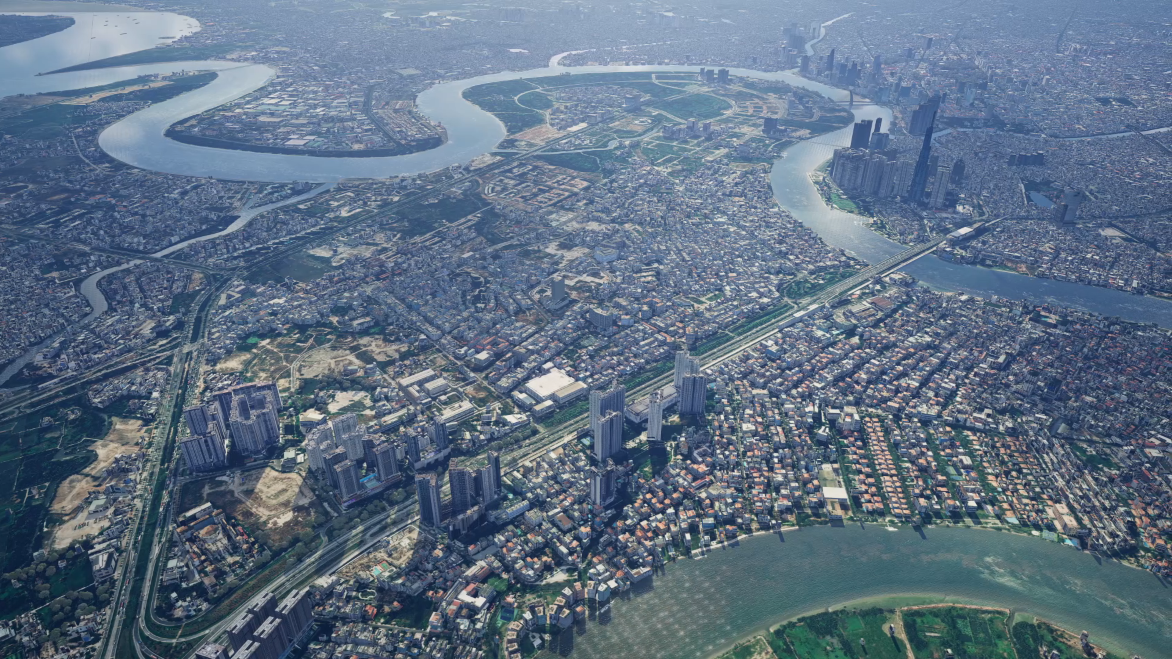 photorealistic enhancement of a high fidelity architectural render of ho chi minh central business area preserve the original building geometry skyline proportions layout and all iconic structures exactly as rendered enhance material realism only improve surface texture clarity on facades especially small residential houses near the main road add realistic concrete plaster stone and asphalt micro detail enhance window glass depth subtle reflections and interior light variation strengthen ambient occlusion in architectural joints and edges improve lighting realism without changing sun direction physically accurate global illumination natural shadow softness and contact shadows subtle atmospheric depth consistent with ho chi minh weather conditions no redesign no added buildings no removed elements no stylistic changes final result should resemble a real architectural photograph not concept art