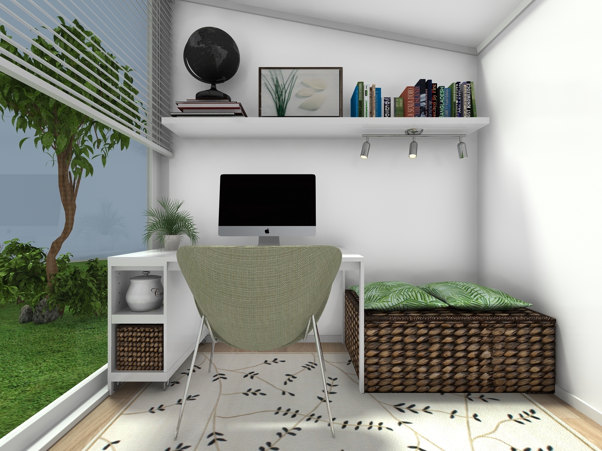 this photo shows a bright and minimalist home office space with a scandinavian inspired design the room features neutral light colored materials primarily wood with a warm natural light tone throughout the overall color palette is soft with light wood tones white walls and green plants adding pops of color the furniture and shelving units are made of light beige or pale wood and the plants bring in various shades of green the black screen of the monitor contrasts with the white shelving boxes sunlight creates a warm inviting glow casting soft shadows and highlights across the room wood is the predominant material in the room used for the desk shelving and storage units the chair is a combination of molded plastic for the seat with metal legs the plants are in simple white ceramic pots and the bench or cushioned seat has soft fabric likely cotton the design remains simple with clean lines and minimal patterns the shelving boxes are rectangular with no additional textures and the hanging plants have cascading linear shapes contributing to an organic feel the flooring is light colored wood without any visible pattern enhancing the minimalist aesthetic overall the space follows a scandinavian style clean functional and understated focusing on natural light and neutral tones it s designed to feel airy light and uncluttered making it perfect for both work and relaxation architecture