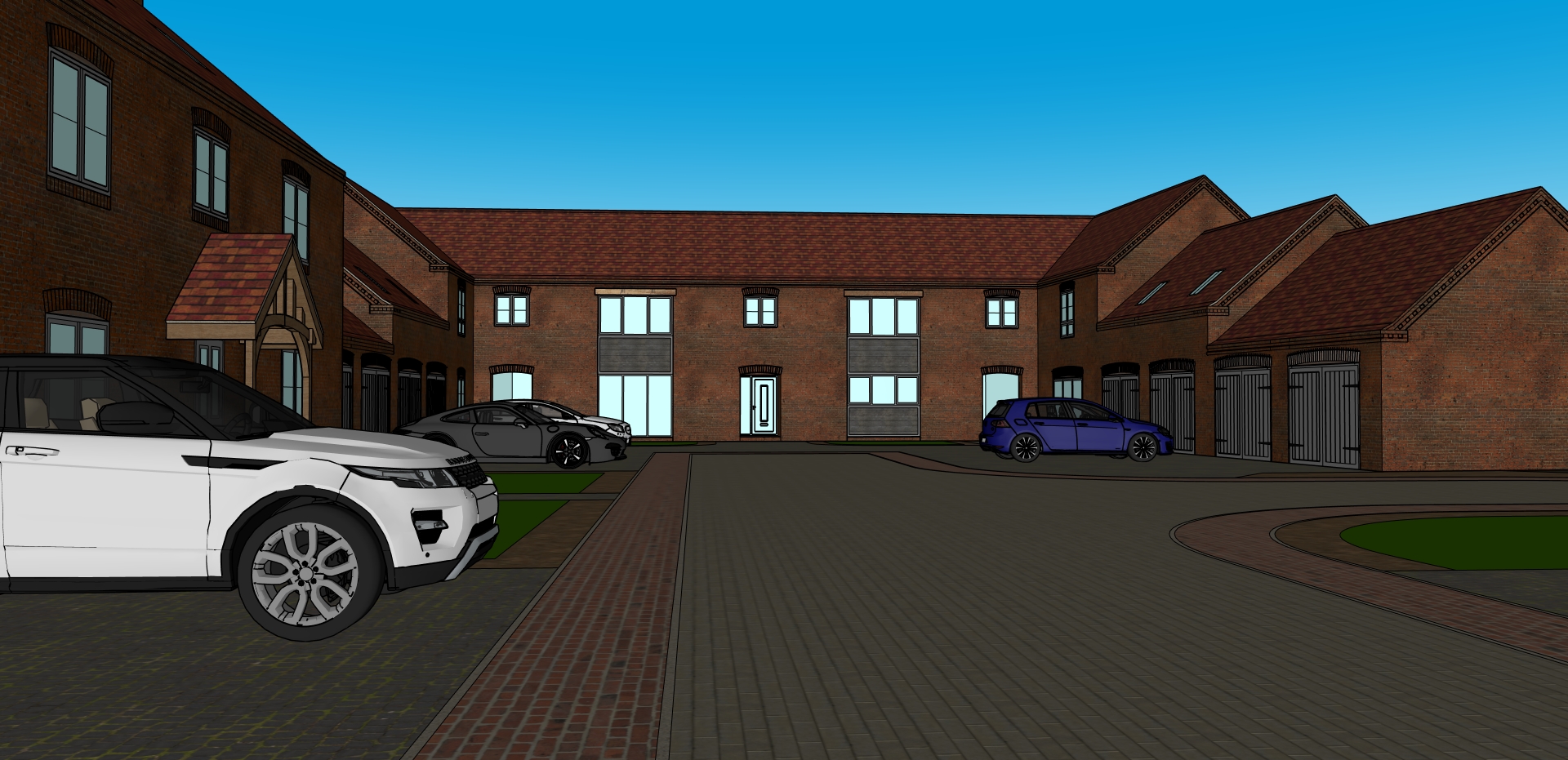 red double pan roof tiles grey windows and doors heringnone driveway