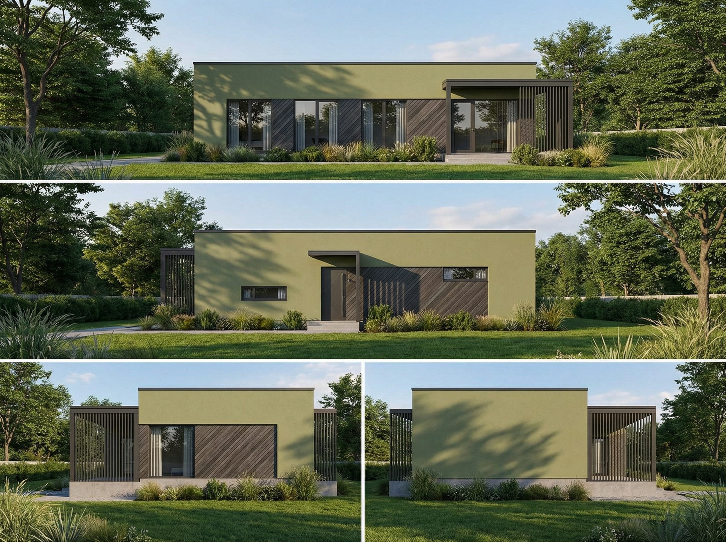 modern minimalist architecture elevations single story rectangular house olive green facade with dark gray 45 degrees wood planks large glass windows sleek metal slats set in a serene suburban environment soft natural lighting some greenery in the surroundings a couple scots pines calm and tranquil atmosphere cloudy blue sky backdrop with light clouds warm and inviting tones