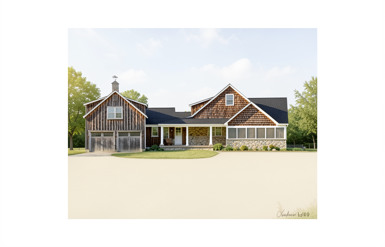new cedar shingle siding old vertical barn board siding at garage fieldstone veneer under covered porch only black asphalt shingle roof white columns garage trim weathered board