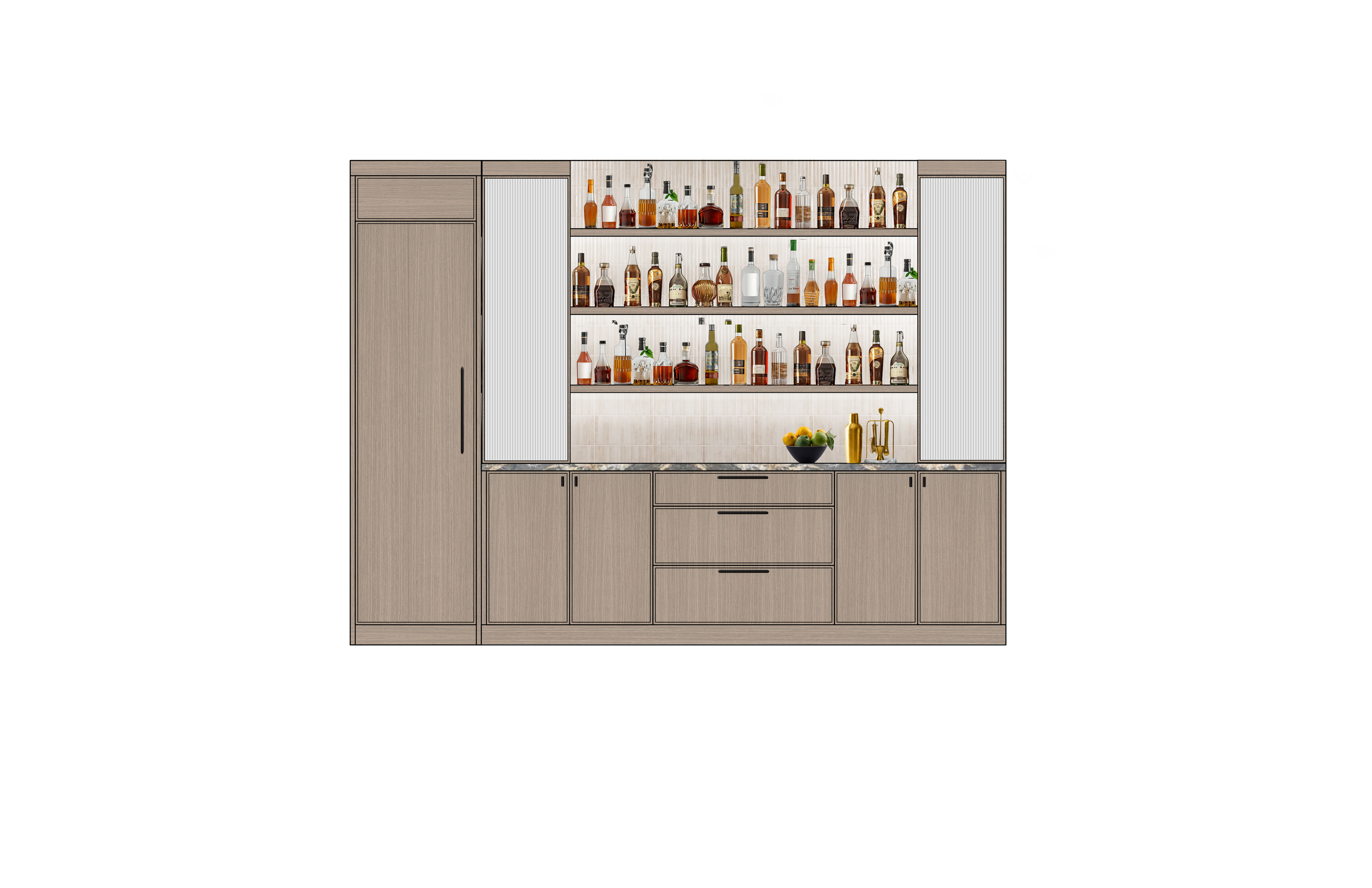 the cabinets are light gray wash light oak the cabinets on either side of the shelves have fluted glass