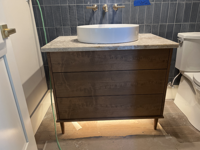do not change the cabinets in any way preserve the exact cabinet colors materials finishes dimensions door and drawer styles hardware spacing alignment and all geometry exactly as shown do not alter the countertop shape backsplash appliances flooring lighting fixtures or wall structure only remove the construction materials clutter and mess from the scene clean the room and make it look finished and staged add a few simple tasteful home accessories appropriate for the style of the space but do not add or remove any furniture windows or architectural elements maintain the original lighting direction and realism enhance clarity and polish the photo while keeping the cabinetry and room design completely unchanged do not alter the lighting to keep the cabinet colors as they are in the image add new flooring remove the door on the left add a mirror over the faucet stage for a luxury powder bath