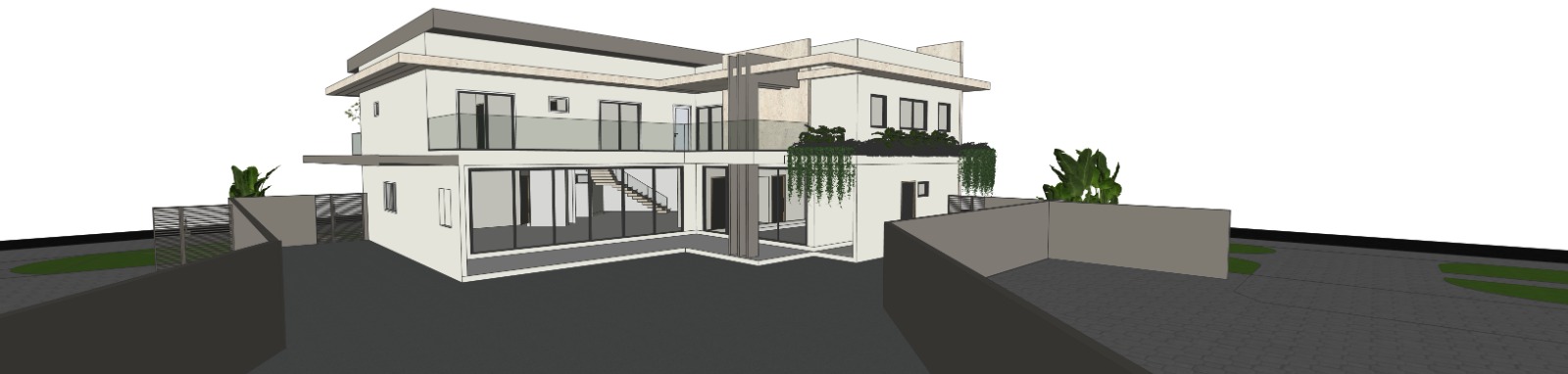 make it ultra realistic facade keep all materials take back fence out make a thin rectangular pool coming out of the sauna on the right middle side of the house make a cascade waterfall where the plant is on the first floor ceiling on the right side take plant off