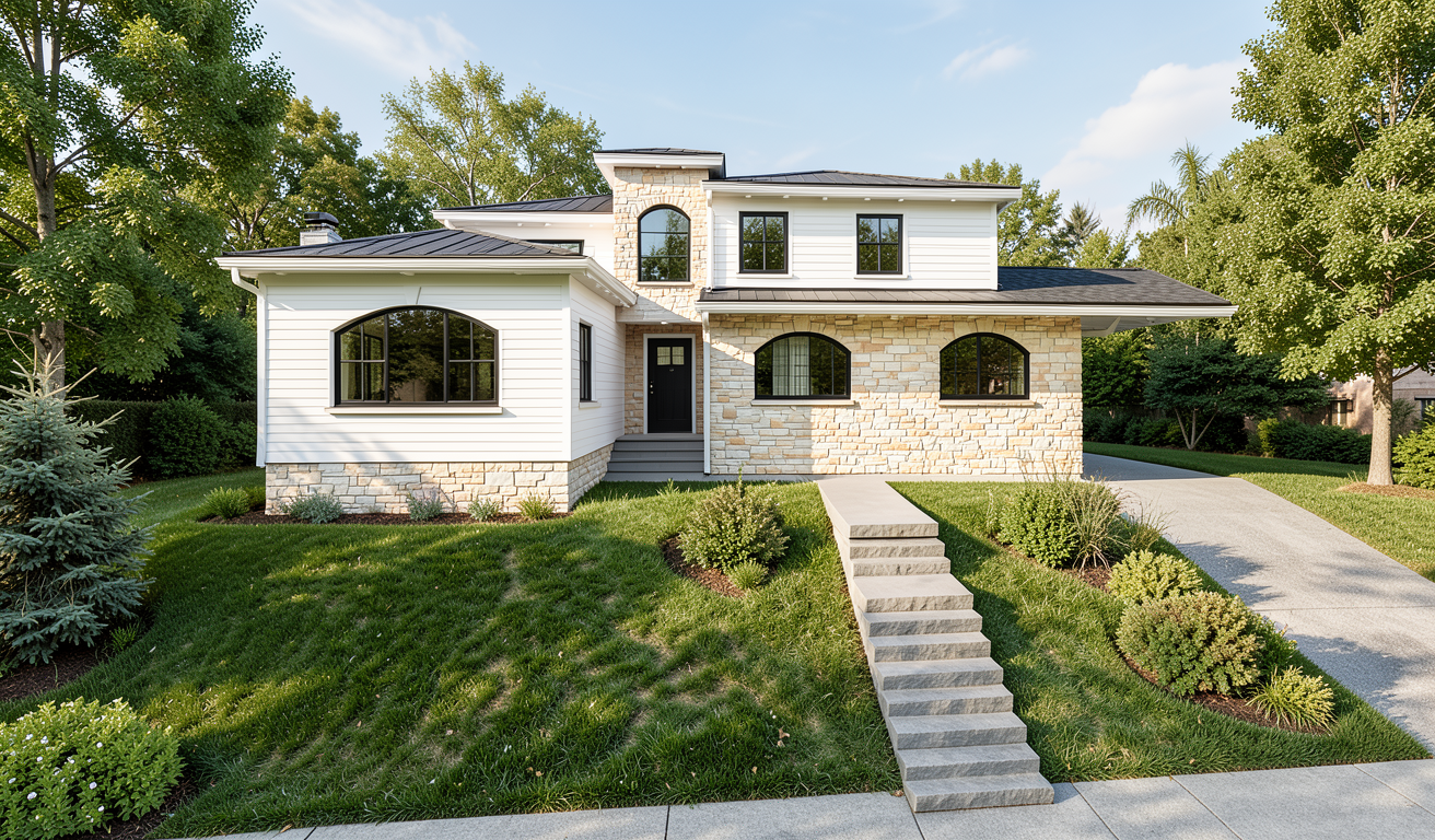 exterior white wood siding light color stone veneer black window frames