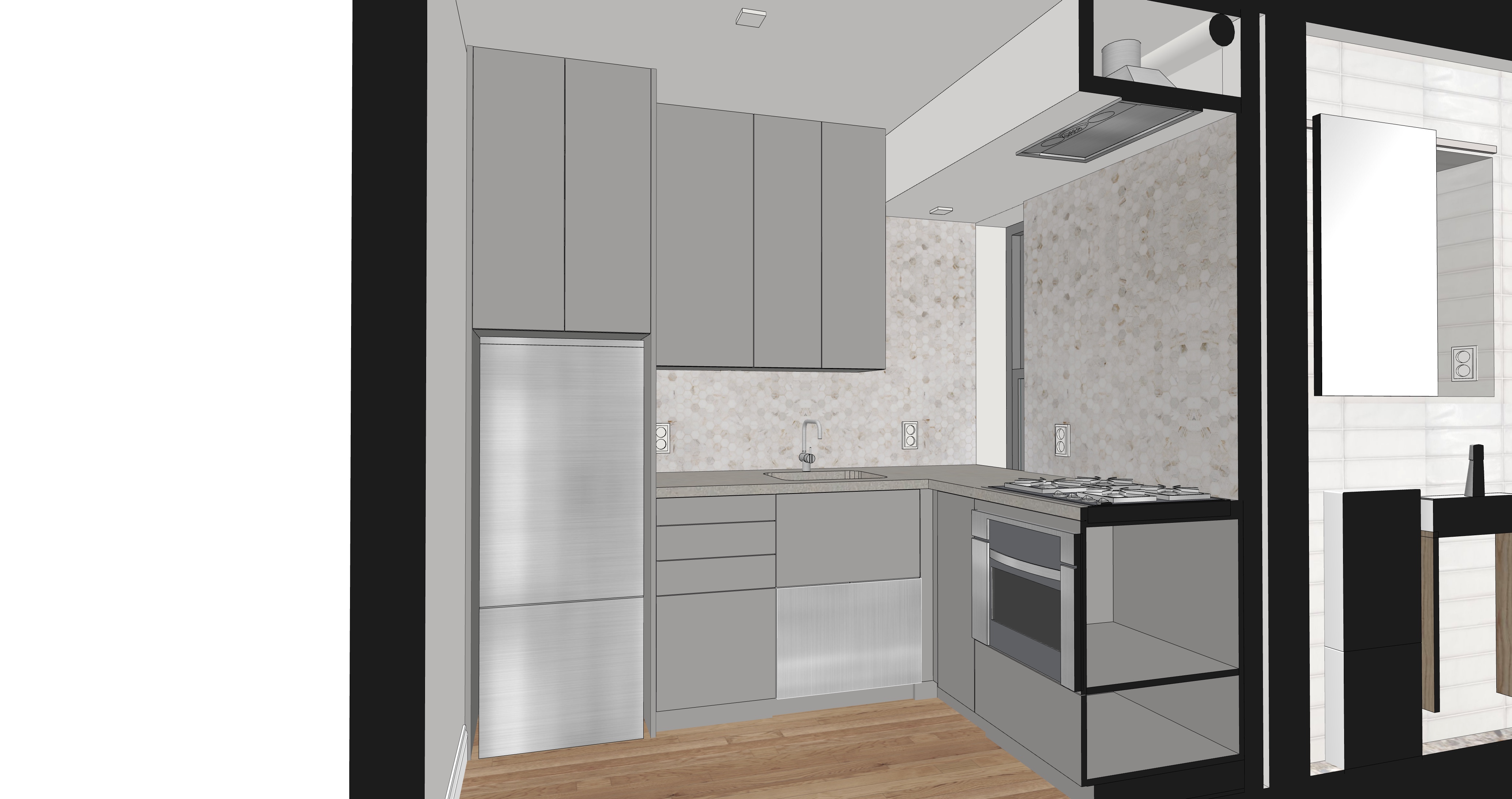 tiny city apartment kitchen dimly lit at night for a cocktail party marbel hexagon backsplash stainless steel appliances matt gray cabinets