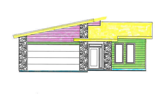 change the yellow roof to black shingles change the yellow fascia to black change the green lap siding to woodtone rustic series james hardie warm espresso change the stone columns to craft split modular black truffle change the blue to light concrete grey color change the front door to black change the pink to james hardie aged pewter change the garage door to charcoal change the trim piece above the garage to match the woodtone change the window trim to black