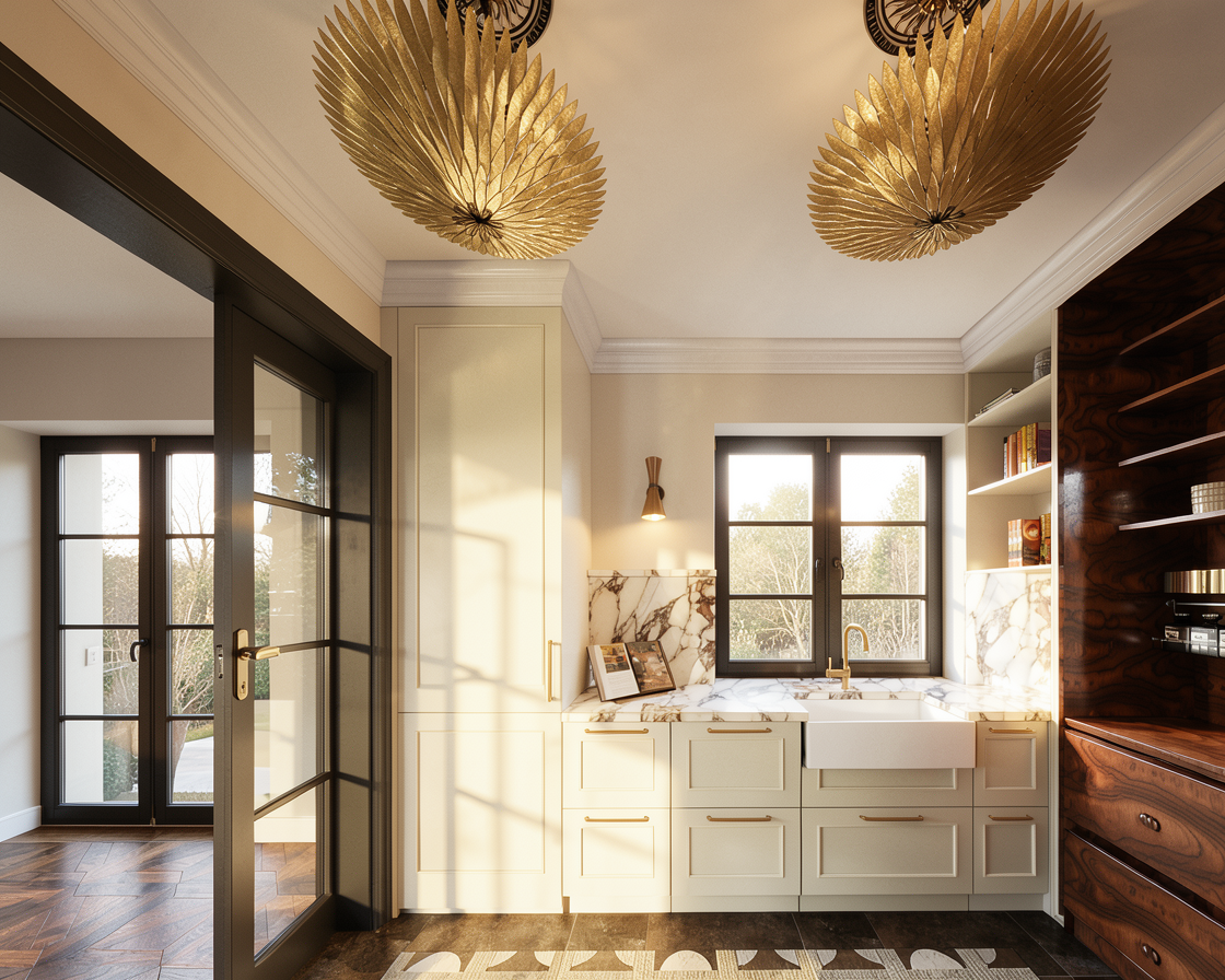 e una sala per cene luce soffusa a terra abbiamo un pavimento in parquet in rovere chiaro continuo e liscio la cucina ha una strip led sotto i pensili e piastrelle verde lucido non c la strip led nello zoccolo della cucina nella parete di fondo dipinto un arco verde al centro abbiamo una tavola con il piano in marmo calacatta e gambe in ferro nero sopra alla tavola ci sono delle lampade a sospensione in ceramica opaca verde e sono accese le sedie sono in legno di colore verde chiaro metti qualche piatto sparso sulla tavola per simulare una cena gi iniziata e qualche attrezzo sul piano di lavoro della cucina sulla parete di destra abbiamo degli sgabelli in legno rovere chiaro e un piano in marmo con strip led sotto sopra la mensola in marmo ci sono delle piastrelle verdi dalla finestra entra una luce naturale di tramonto