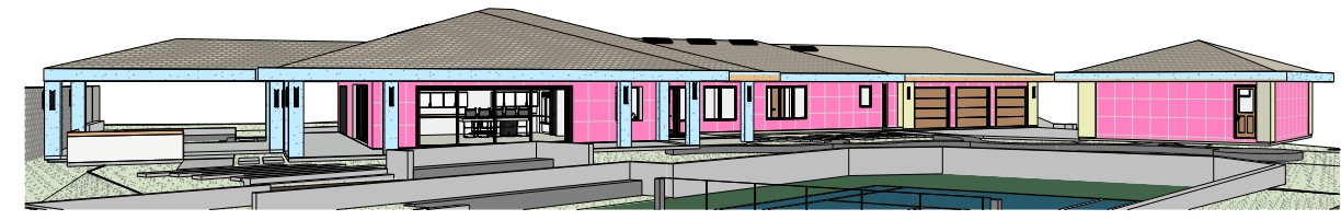 realistic rendering using following materials pink walls limestone beige 24x48 size blue areas smooth stucco color to match stone yellow areas smaller stone veneer lighter color that limestone roof slate tile charcoal blend brown gray walls concrete color light green natural grass darker green artificial turf blue area is a tennis court brown doors wood glass doors and windows black metal