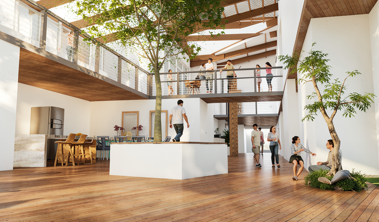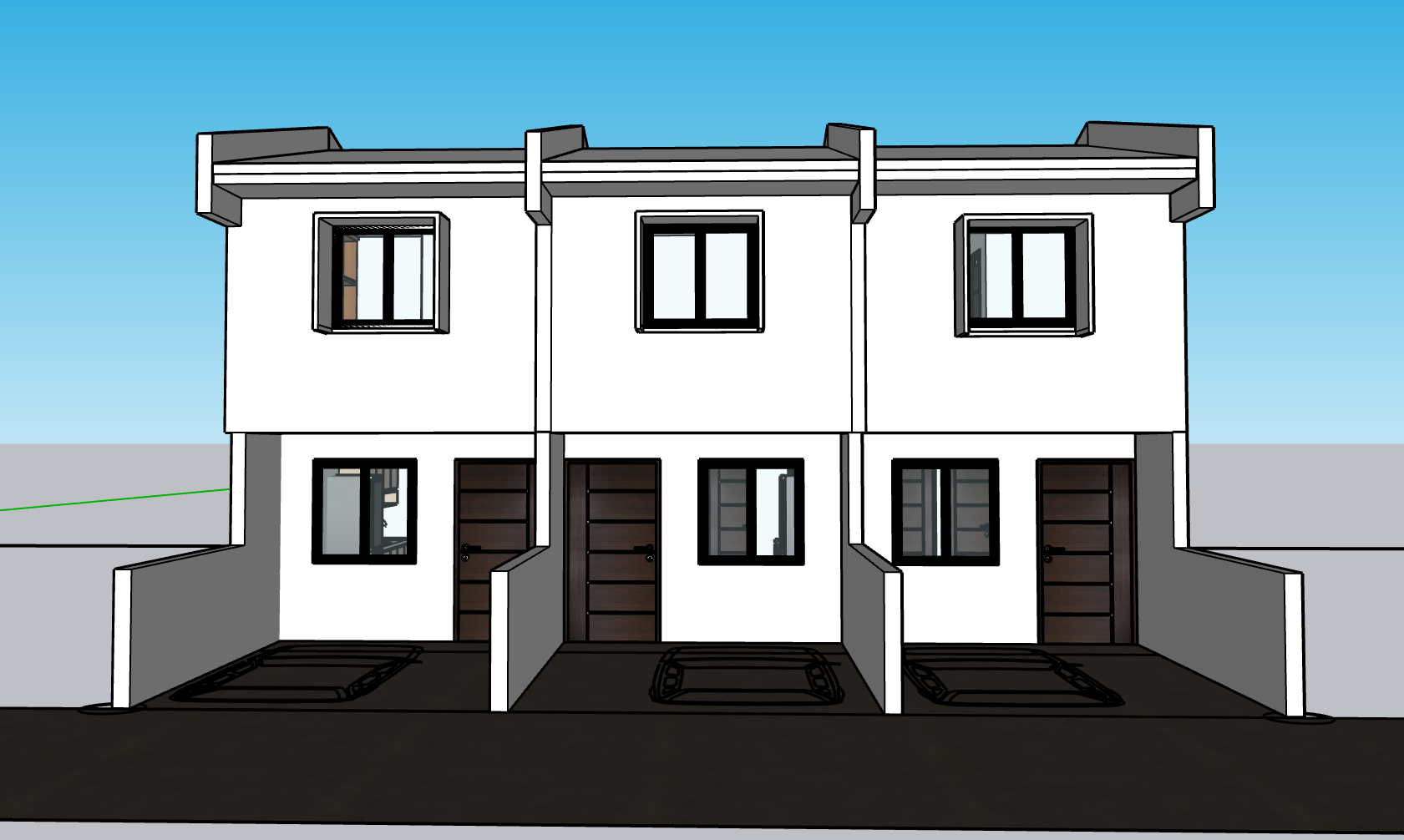 modernist exterior shot add car parked in the front of each door make it a minimalist tropical design add people architecture
