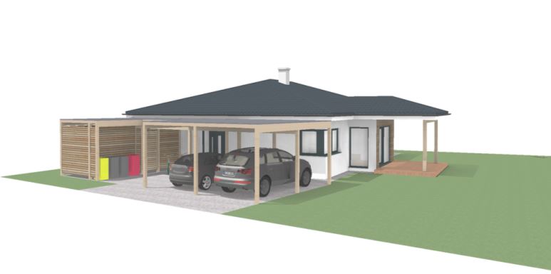 bitte um ein fotorealistisches bild ma e positionen und farben gleich lassen 2 autos im carport audi a3 sprotback und audi q5 kein drittes auto querstra e im vordergrund je 1 niedriger laubbaum links und rechts im hintergrund
