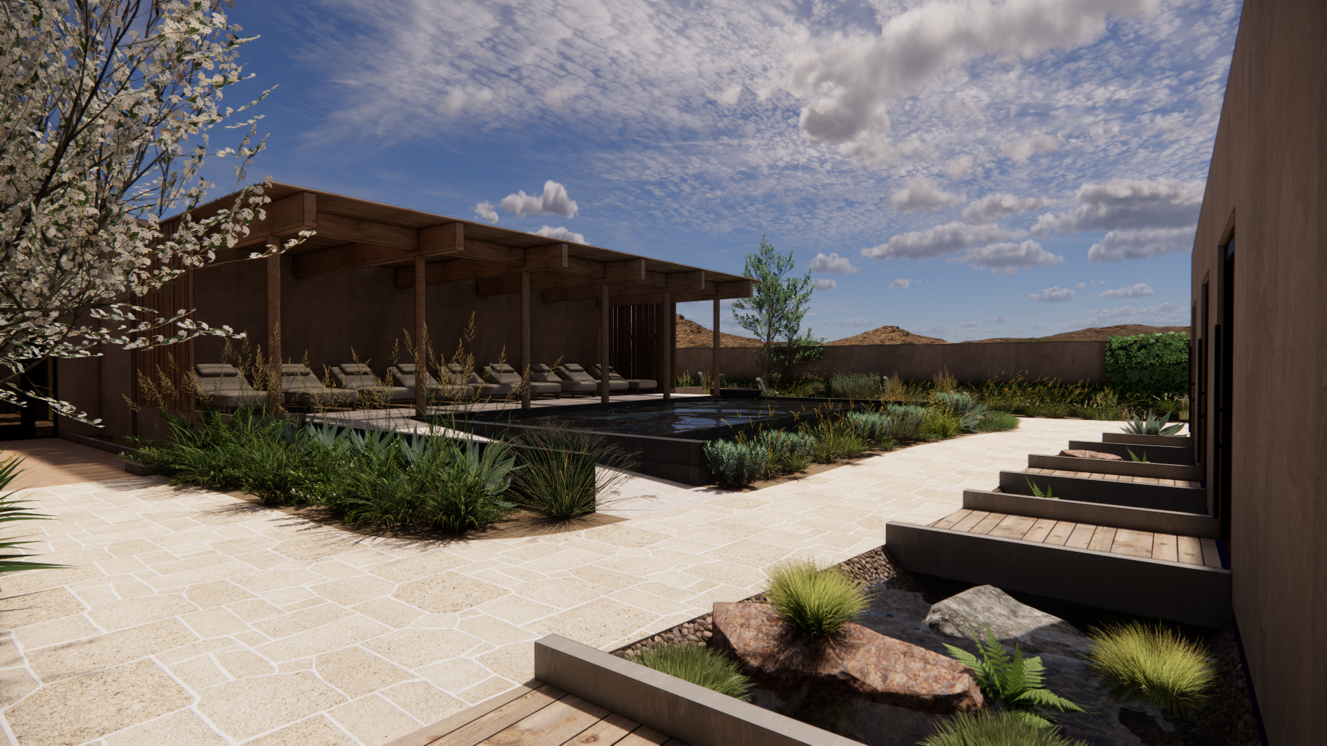 enhance rendering and make it realistic its set in palm springs california add palm trees in the background and palm springs downtown in the distance with the mountains pool has infinity edge