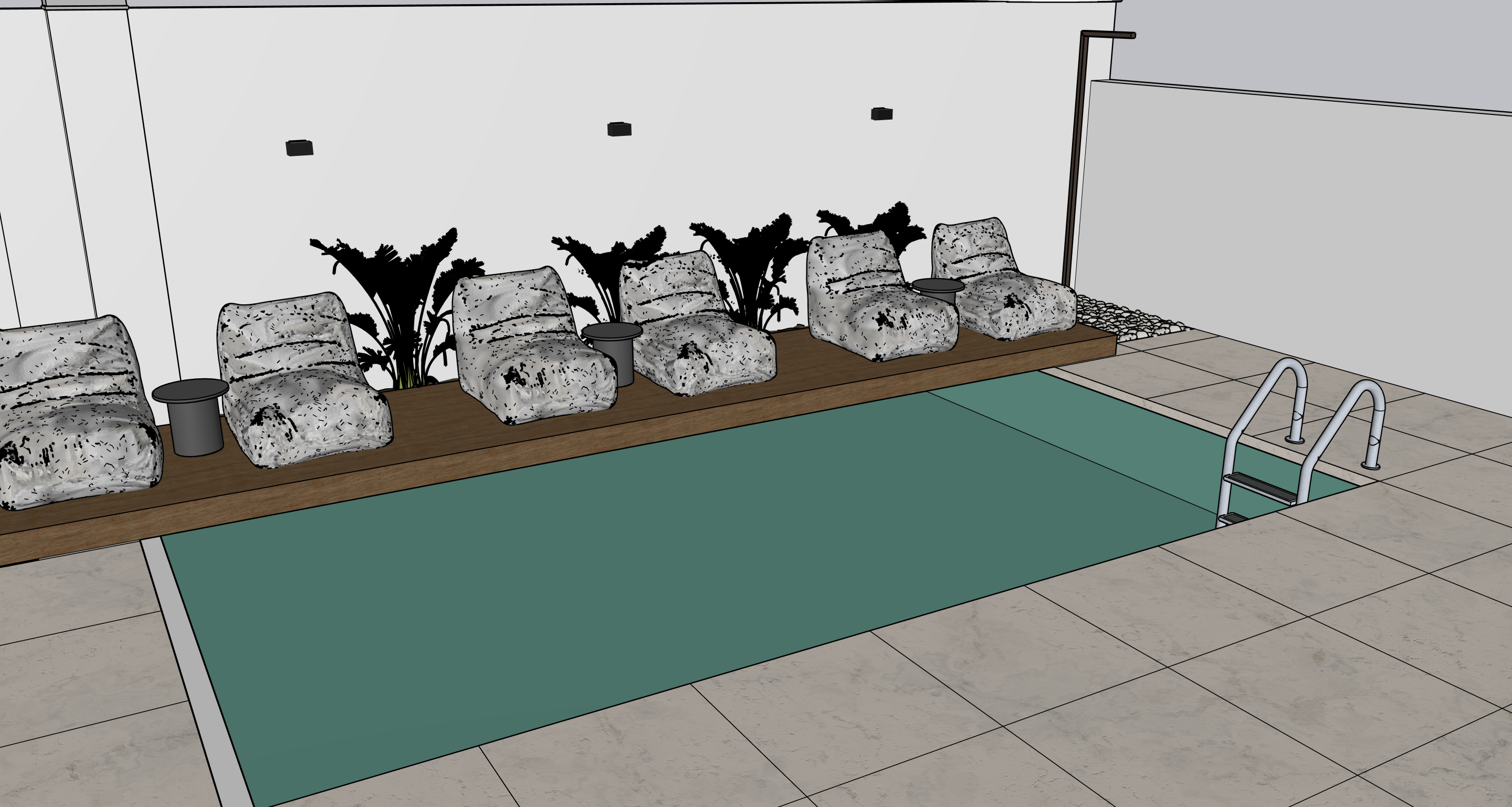 a luxury exterior render captured as a photograph based on a simple 3d sketch model keep exact layout do not modify distribution fraturing a pristine swimming pool with a sleek wooden platform along it for tanning in sandy linen fluffy sofas with elegant black coffee tables in between pairs shape distribution and style as showed in the reference image with native plans from the south of spain behind the platform and against the wall including a palm arranged organically to reflect the natural environment the walksides of the pool showcase a beige minimalist porcelanic tiles and the interior of the pool a bali vibes tile with different tones of greens a minimalist freestanding shower column linear slim vertical monolithic form black matte finish floor mounted with rocks in its base light beige fine textured stucco walls matte finish subtle sandy grain with matte black squared wall lights modern brushed chrome finish for the metallic pool stairs a towel over one of the sofas and a drinks on the tables the natural light of the sun creates realistic shadows and reflections on the water emphasizing the rich textures of the wood porcelanics fabrics and vibrant foliage every detail from the smooth surface of the pool to the intricate patters of the leaves is captured in ultra realistic and hyper detailed finishes rendered in 8k cinematic composition