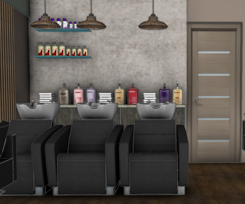 interior european hairdressing salon backwash area with grey rock cliff outcrop effect wall behind the backwash reclaimed industrial weathered down lights reclaimed oak paneled wooden flooring