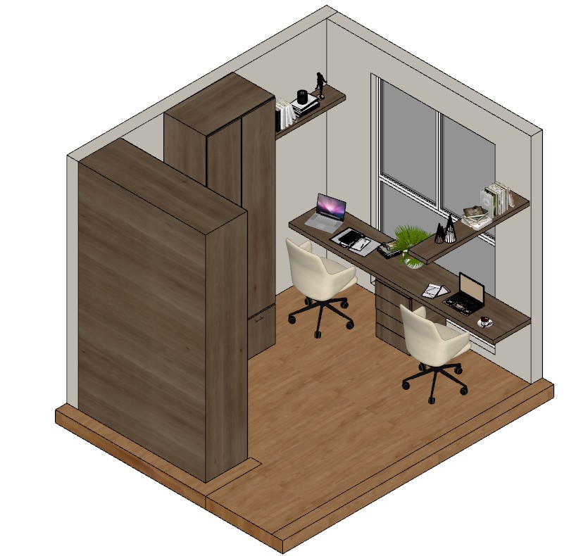 contemporary home office interior axonometric view strictly based on provided 3d model preserve exact geometry proportions and layout without adding removing or modifying any elements maintain original materials textures and colors exactly as shown beige walls light natural wood flooring and medium tone wood furniture do not reinterpret or enhance materials no gloss no extra reflections no surface variation the desk must be placed directly against the wall and aligned with the window with absolutely no gap or separation between the desk and the window the desk is fully attached flush to the wall lighting must remain completely neutral and flat with no added artificial lighting no dramatic shadows no ambient glow no led effects and no sunlight simulation use only uniform shadowless lighting as in a raw architectural model display furniture includes a linear wooden desk attached to the wall two upholstered chairs in light fabric upper floating shelves and a tall wooden storage unit keep all objects exactly as modeled including placement and scale window must remain in the same position and size outside the window include a subtle realistic view of a single tree as seen from a third floor apartment soft focus no strong lighting no sky dramatization camera angle axonometric isometric perspective clean and technical no perspective distortion overall style highly realistic but strictly faithful to the original model no artistic reinterpretation no added decor no extra objects no changes in composition