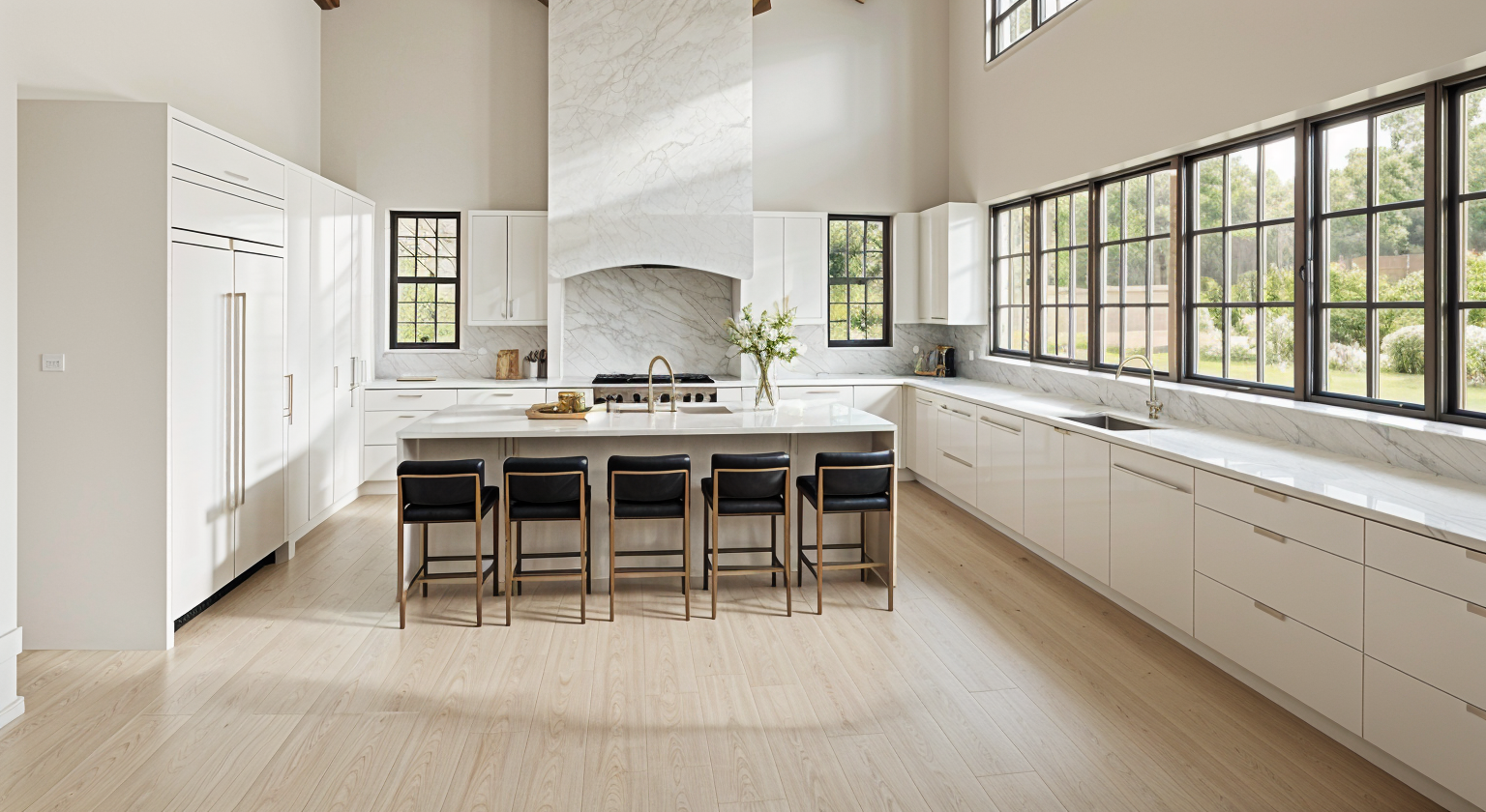 keep camera angle as shown in the original black and white image use bleached oak wood flooring cream colored cabinets and marble countertops