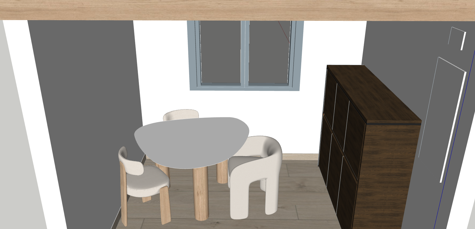 mesa de microcemento blanco texturizado con patas de roble natural y suelo parquet tipo roble mueble de madera vintage y marco de ventas azul gris y vistas a la monta a nevada de andorra