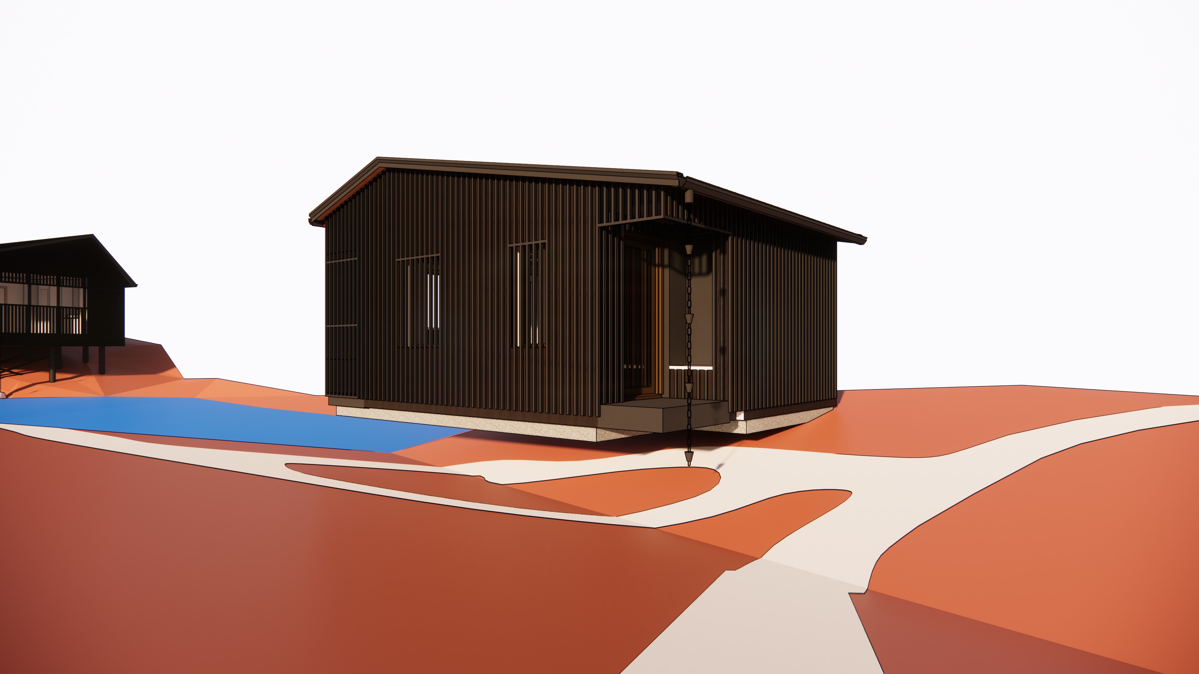 the wall material is black burned wood please make it realistic and leave the landscape as it is the ground is dark brown with lush deciduous plants leave the original structure openings are in dark black accurately follow the geometry around the openings the right side is dark make it brighter
