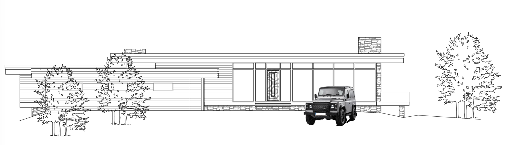 render this elevation of a ski home in the high mountains of utah at powder mountain this elevation is the main entry court with parking the garage doors should be just visible by changing the perspective slightly to the right vegetation is mostly long mountain grasses there are some 30 firs to the right of the house there are 25 aspen clusters both to the left and right side of the house and the left foreground contains aspen and grass up to the visible side of the garage the stone depicted on the house should be a warm grey dry the horizontal wood siding should be a dark grey brown shou sugi ban the eves should be dark bronze metal with layered drip edges with no rafter tails railing on the deck at the right side is glass render at sunset with the west to the right of the house window mullions should be dark bronze depending on the color mix you use