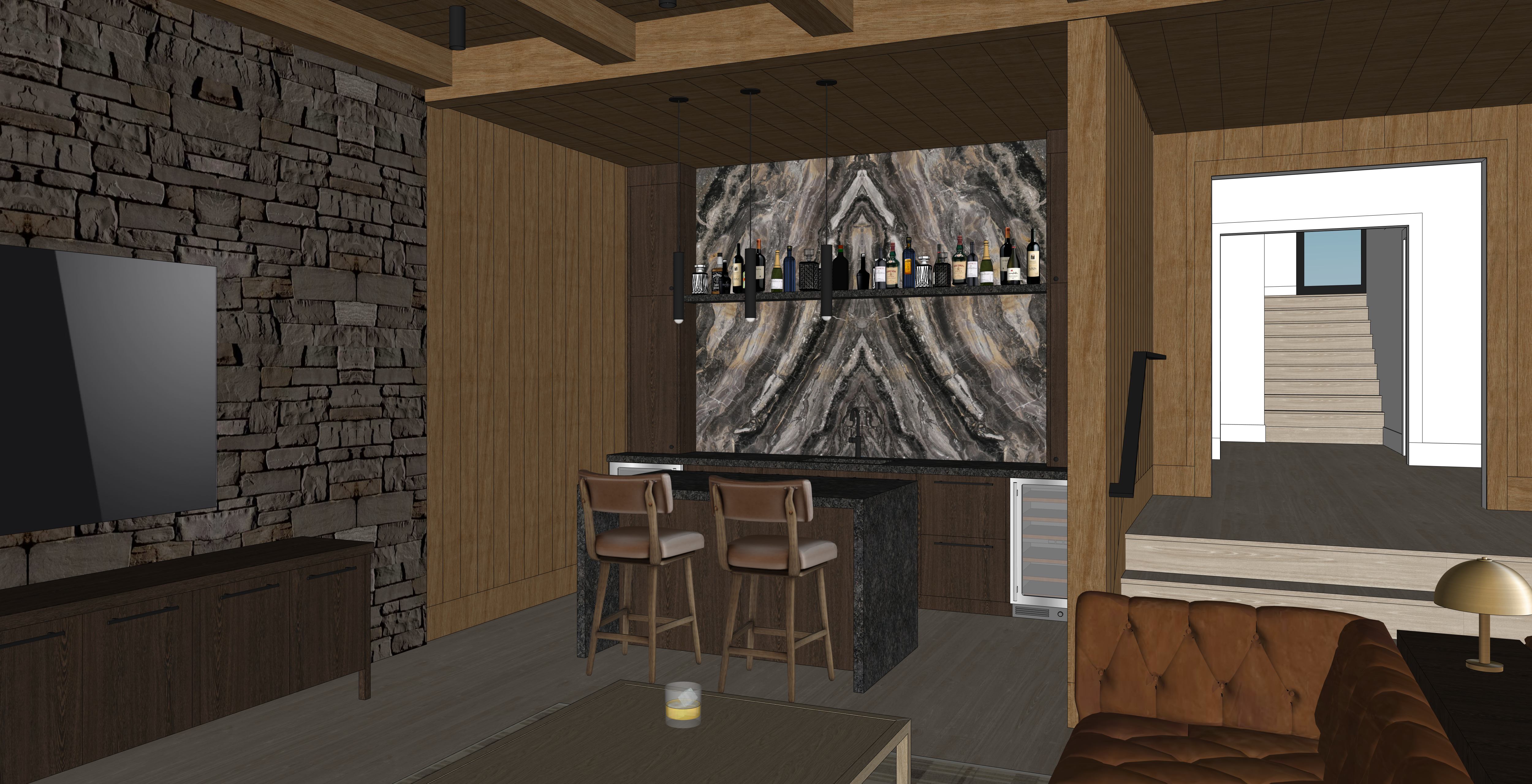 moody basement bar with rustic wood ceiling and light blond hardwood floor some walls clad in rustic wood paneling and some clad in dark stone leather tufted sofa wood coffee table in foreground large tv and dark wood media console in front of stone wall bar has backlit marble backsplash and island with waterfall granite countertop and barstools