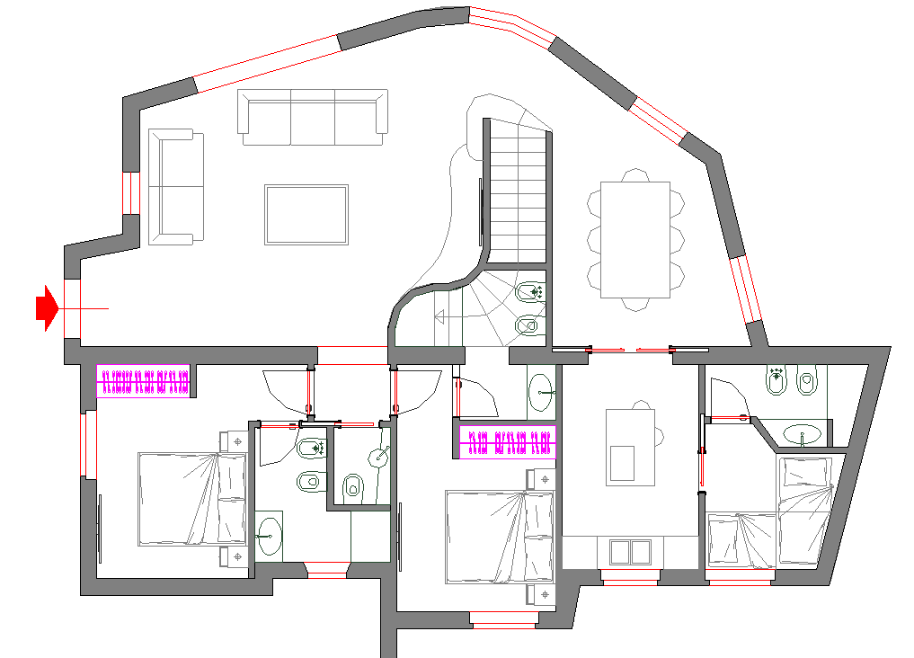 convert this floor plan into a realistic isometric 3d view of a full house show the space from an elevated angle with furniture walls and details visible pavimenta l esterno con la pietra i pavimenti interni sono in parquet di rovere opaco a spina francese usa colori molto tenui per l arredo e non usare stoffe colorate attieniti alla disposizione di progetto use the same furniture as shows on the plan do not change the orientation of the floorplan