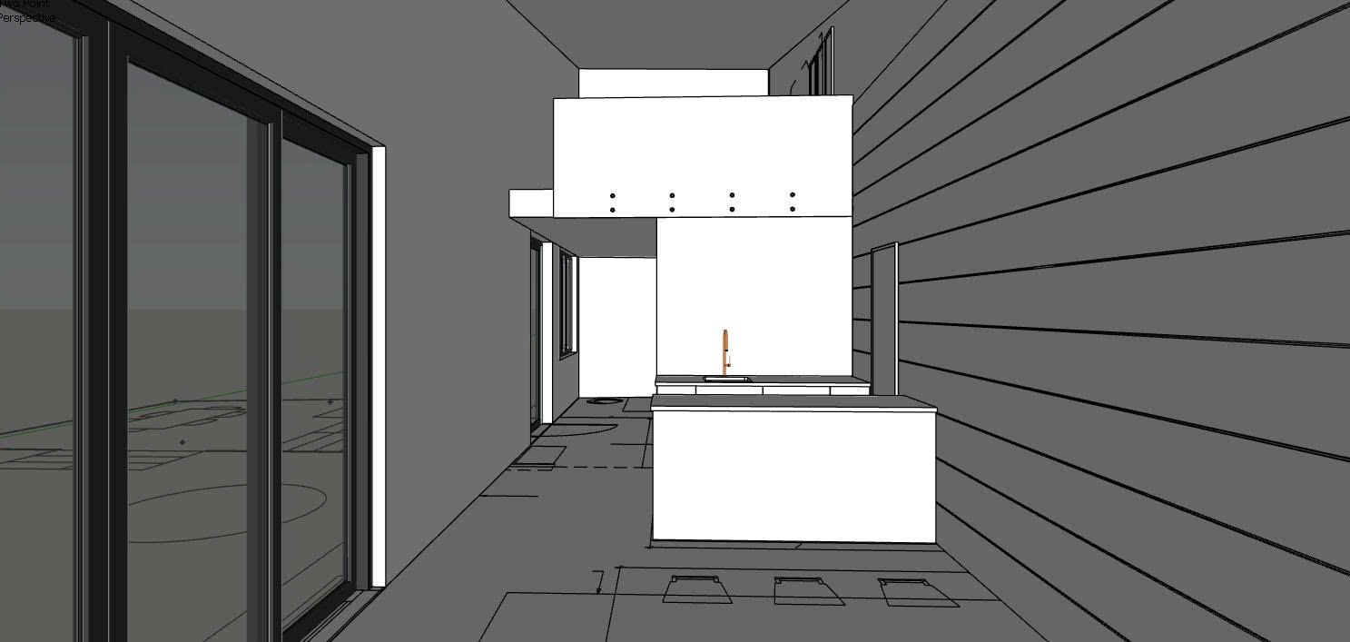 create a photo realistic rendering white oak wood floors perforated metal panels on the back wall which are also a railing for the loft area kitchen counters and backsplash are a travertine