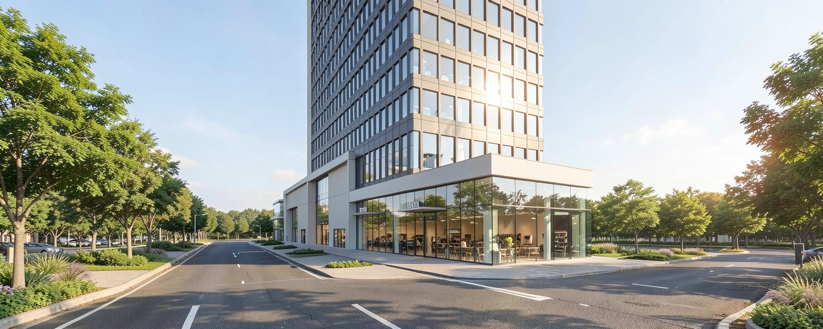 maintain mass add retail at ground floor on left mass only daytime view no cars glass tower above