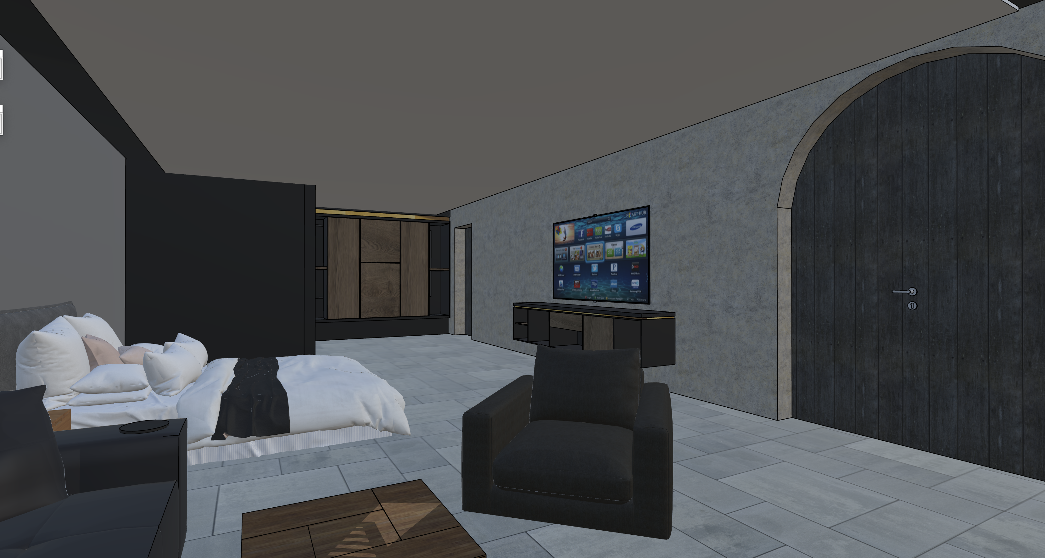 interior scene of a modern elegant loft with industrial and vintage elements the atmosphere is sophisticated and cozy a grand spiral staircase in matte charcoal grey forms an elegant focal point intricate wrought iron railings with gold accents line the balcony dark stone walls with a rustic texture create a warm backdrop large panoramic windows allow natural light to spill onto the cool grey tiled floor a long wooden dining table with a rich walnut finish is paired with sleek chairs featuring light fabric seats sumptuous dark leather sofas offer comfort ornate black chandeliers hang from the ceiling casting delicate shadows the overall color palette features dark greys rich browns hints of gold and soft neutral tones