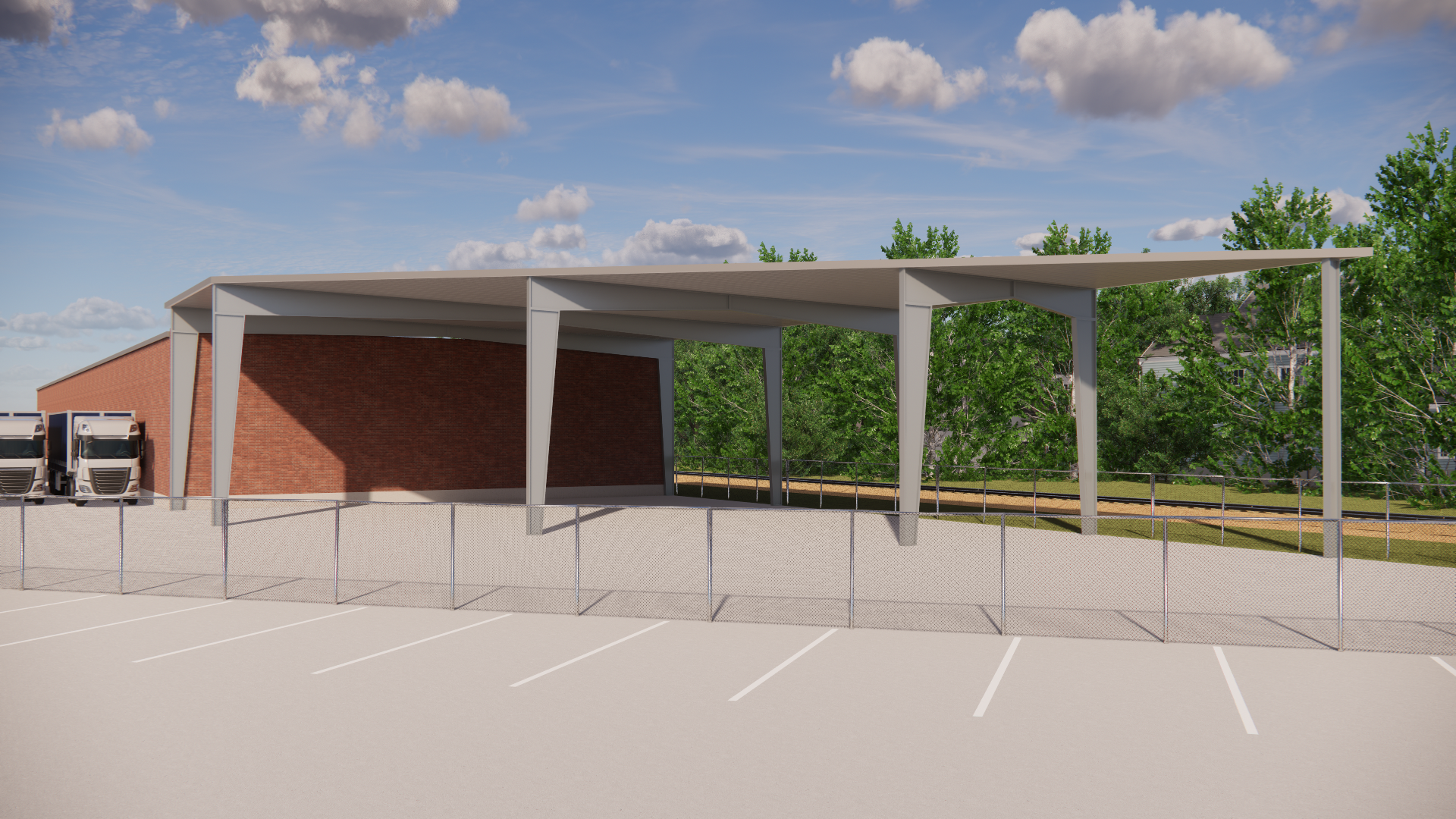steel canopy structure brick building concrete parking lot with chain link fence white architectural steel panel on the underside of the canopy