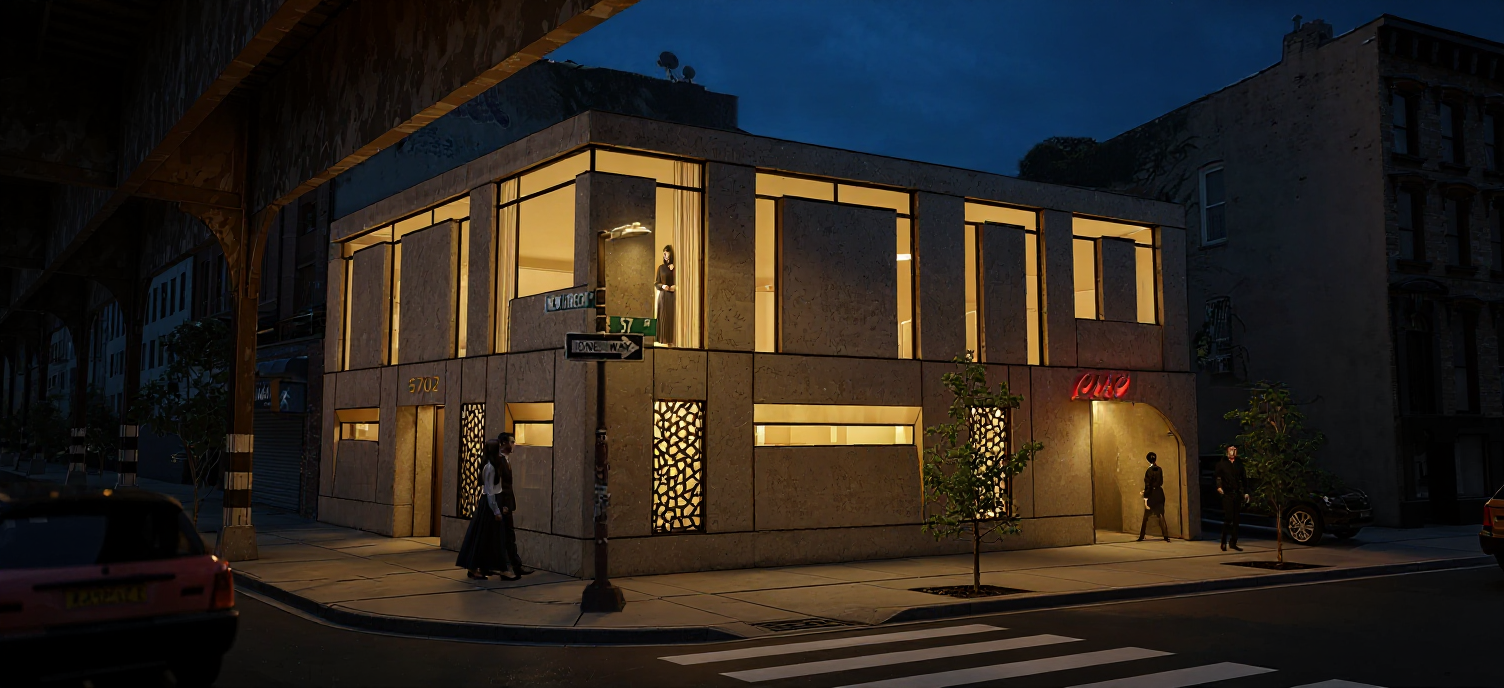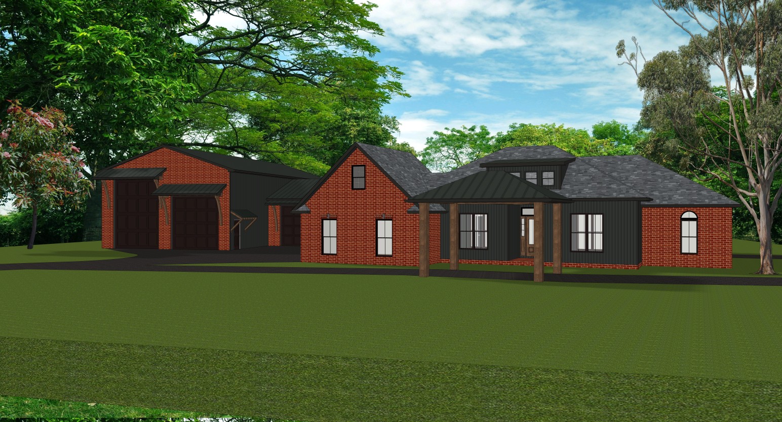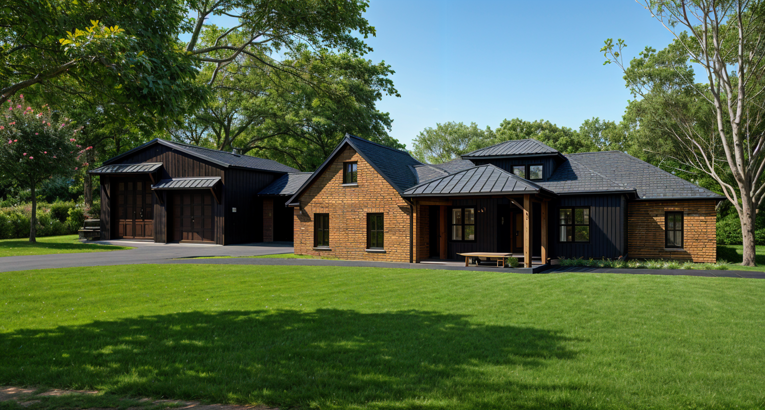 urban industrial farmhouse with dark red brick modern vertical black siding stained walnut wood accents mature landscape architecture