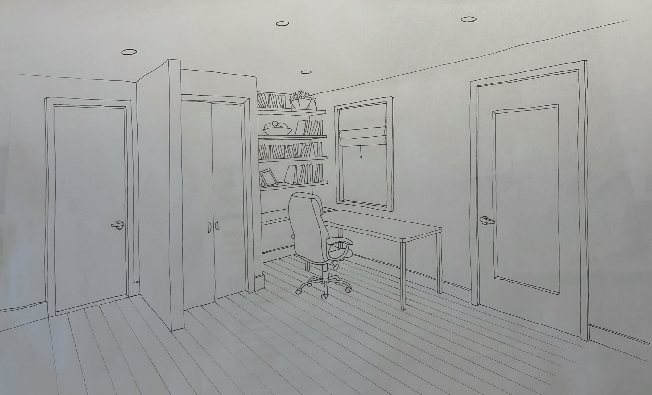 minimalism perspective shot a modern office with light wood floor an elegant wood desk and shelves the walls should be a dark green with wood panels over the closet the atmosphere should be elegant and comfortable with natural light architecture