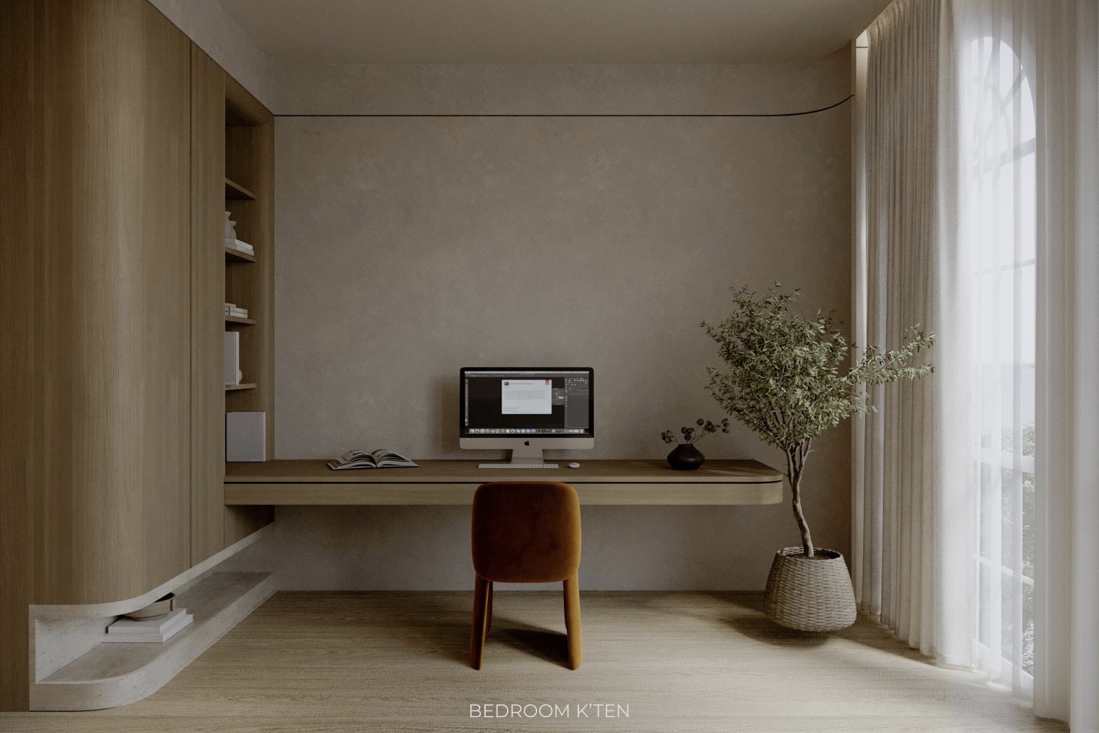 chair is light olive green color big storage spaces above the workspace have light olive green accents warm ambient lighting from the ceiling table walls cabinet and storage spaces