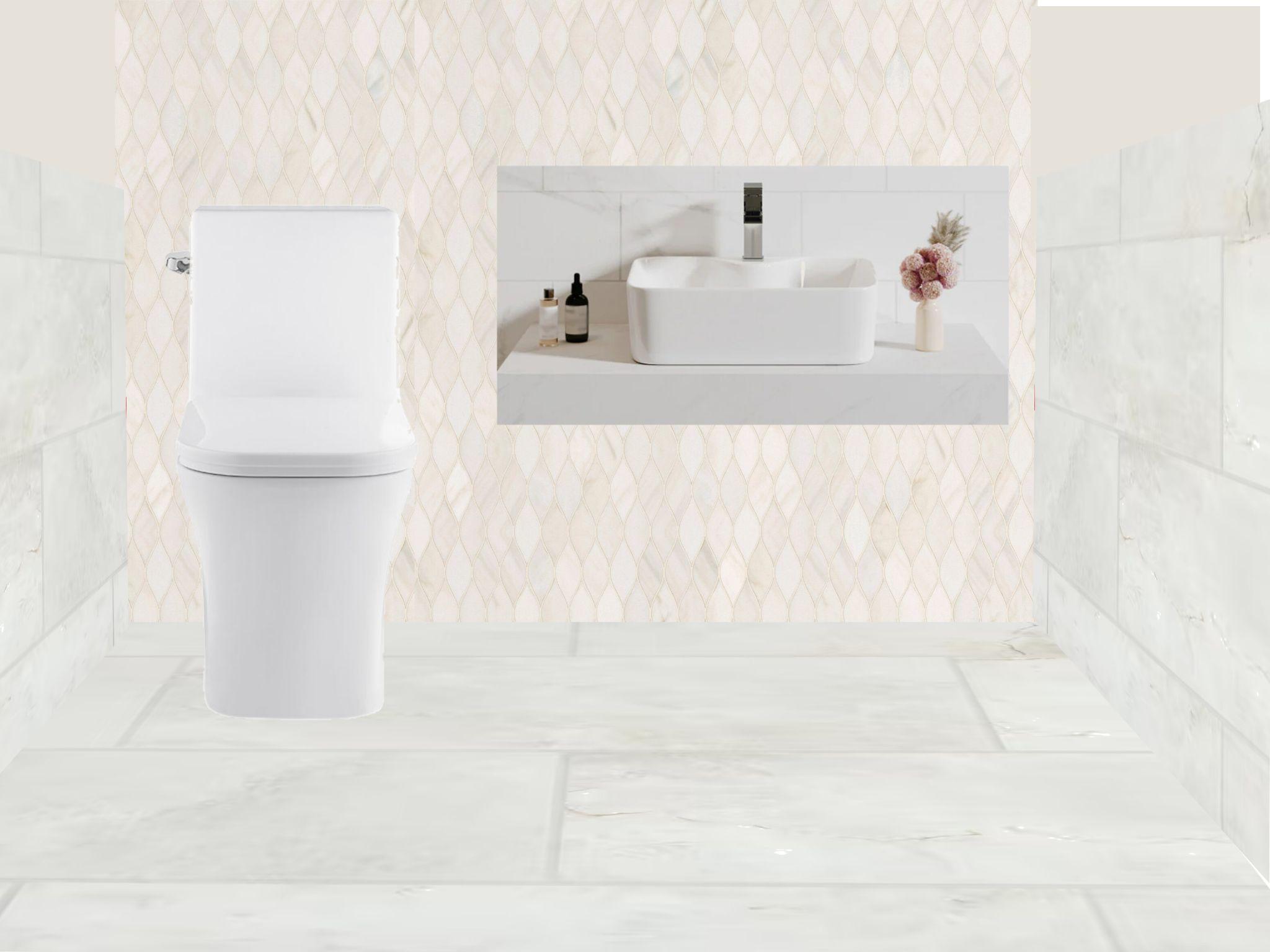 show me a photorealistic rendering of this commercial bathroom with a commercial towel dispenser on the right wall next to the sink and grab bar on the left wall next to the toilet