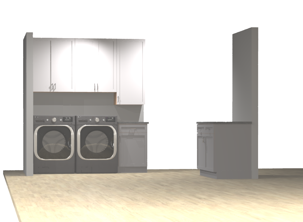 add a white countertop and a 4 backsplash to the cabinets there is a door to the right of the washer and dryer and the cabinet to the right of them