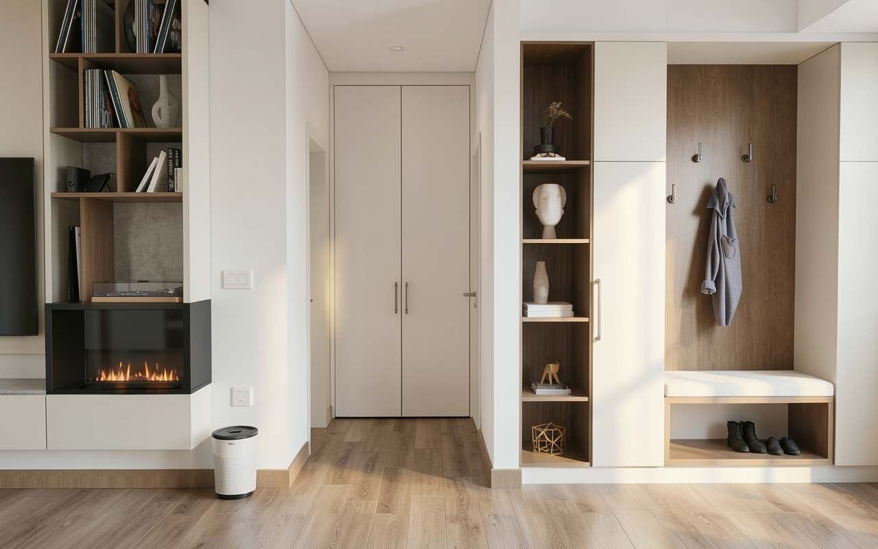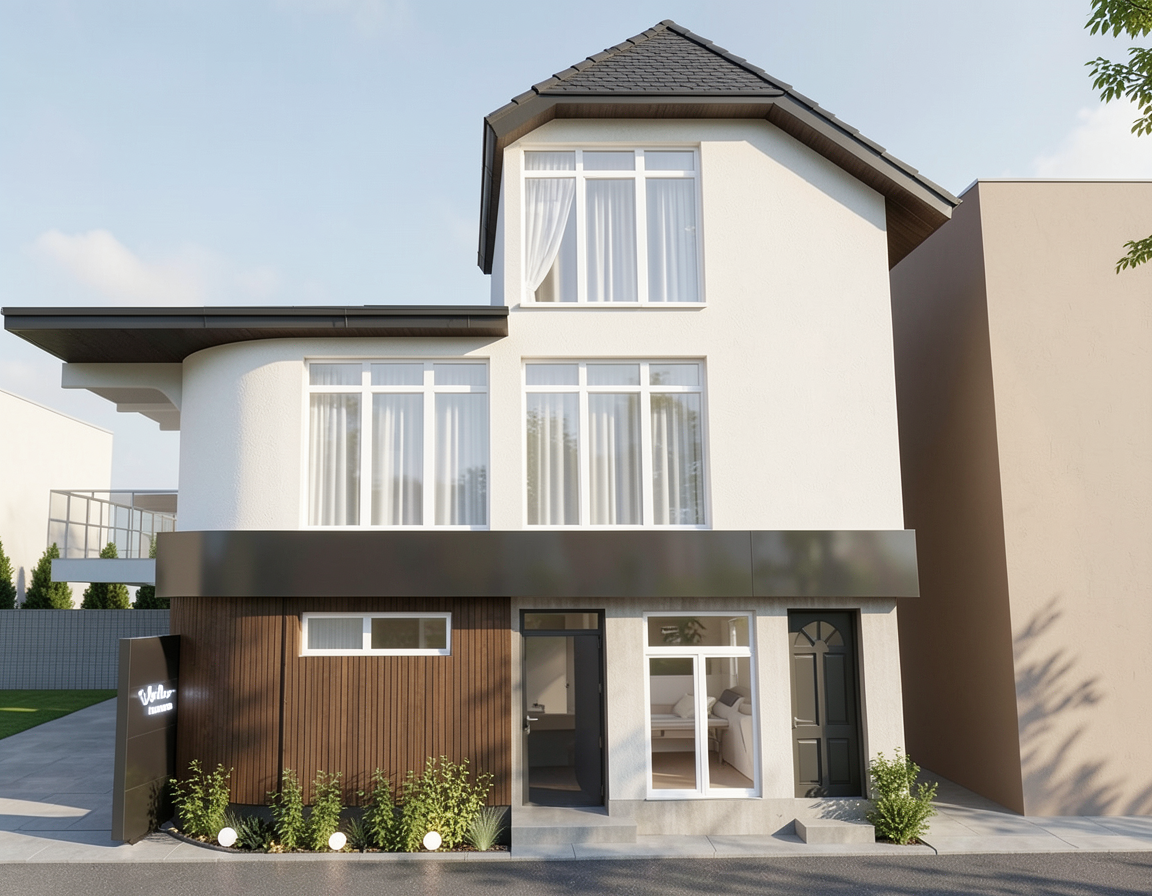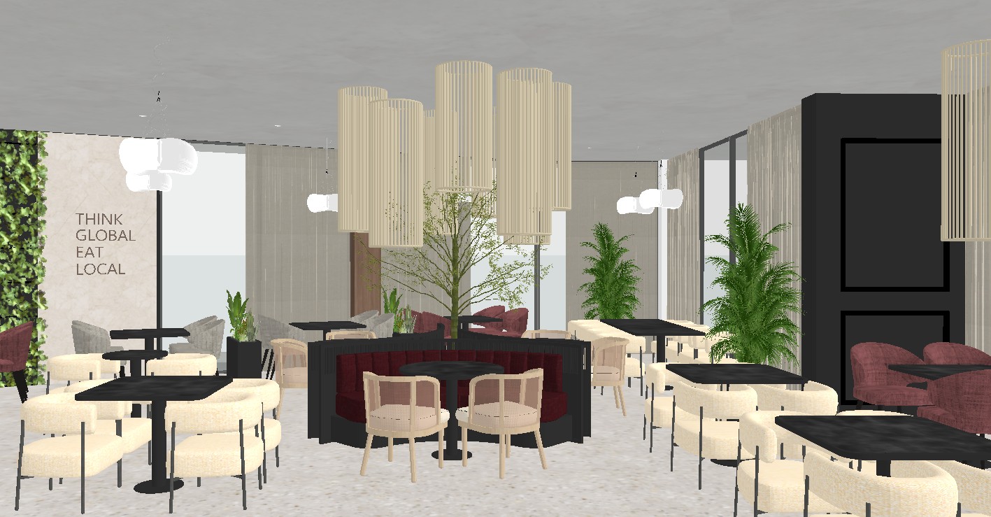 this is a modern interior in the rendering with natural light make it look like it was made at noon don t change anything from the design just replace the materials and objects with more realistic and high quality ones replace the wood material that was used with the same wood material as in the photo but with high quality and few lines make it softer we have terrazzo on the floor on the left side we have a wall with decorative green make it look real and next to it we have a light cream ceramic tile don t change anything there replace the chairs with the same ones but with high quality and real ones the ceiling lights are cloud lights while in the middle of the booth we have light cream colored lights make it real make the tree real and a beautiful tree but let it have the same length replace the curtains with real curtains with a light cream color let the render look real and with high quality let it look like the previous render the lighting and the colors do not change anything in the design