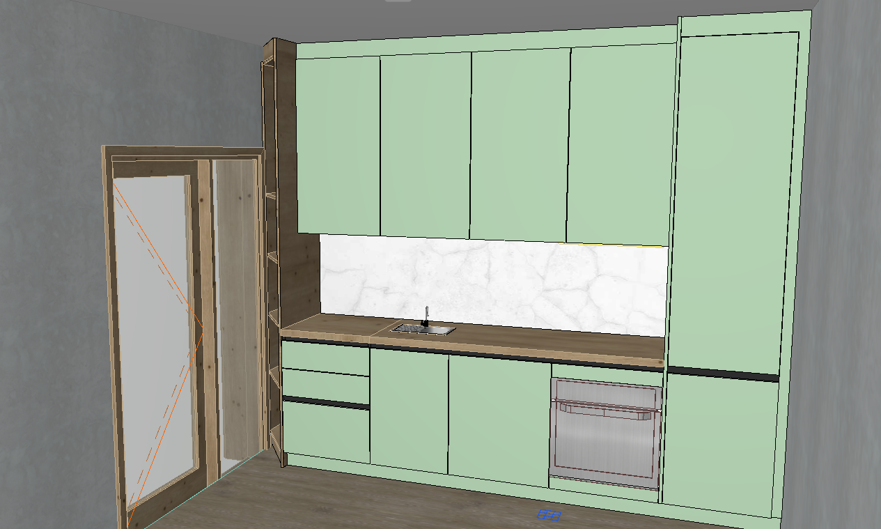 transform this archicad kitchen into a highly realistic photorealistic render while strictly preserving the original layout cabinet design dimensions appliances placement and all architectural details do not redesign do not add new elements and do not change the composition keep everything exactly as modeled only enhance realism the kitchen cabinets should remain a light soft green color elegant and modern preserve the original worktop furniture structure and all details exactly as in the model use realistic pbr materials natural wood or stone textures where already present accurate reflections subtle imperfections soft shadows balanced global illumination and realistic natural d
