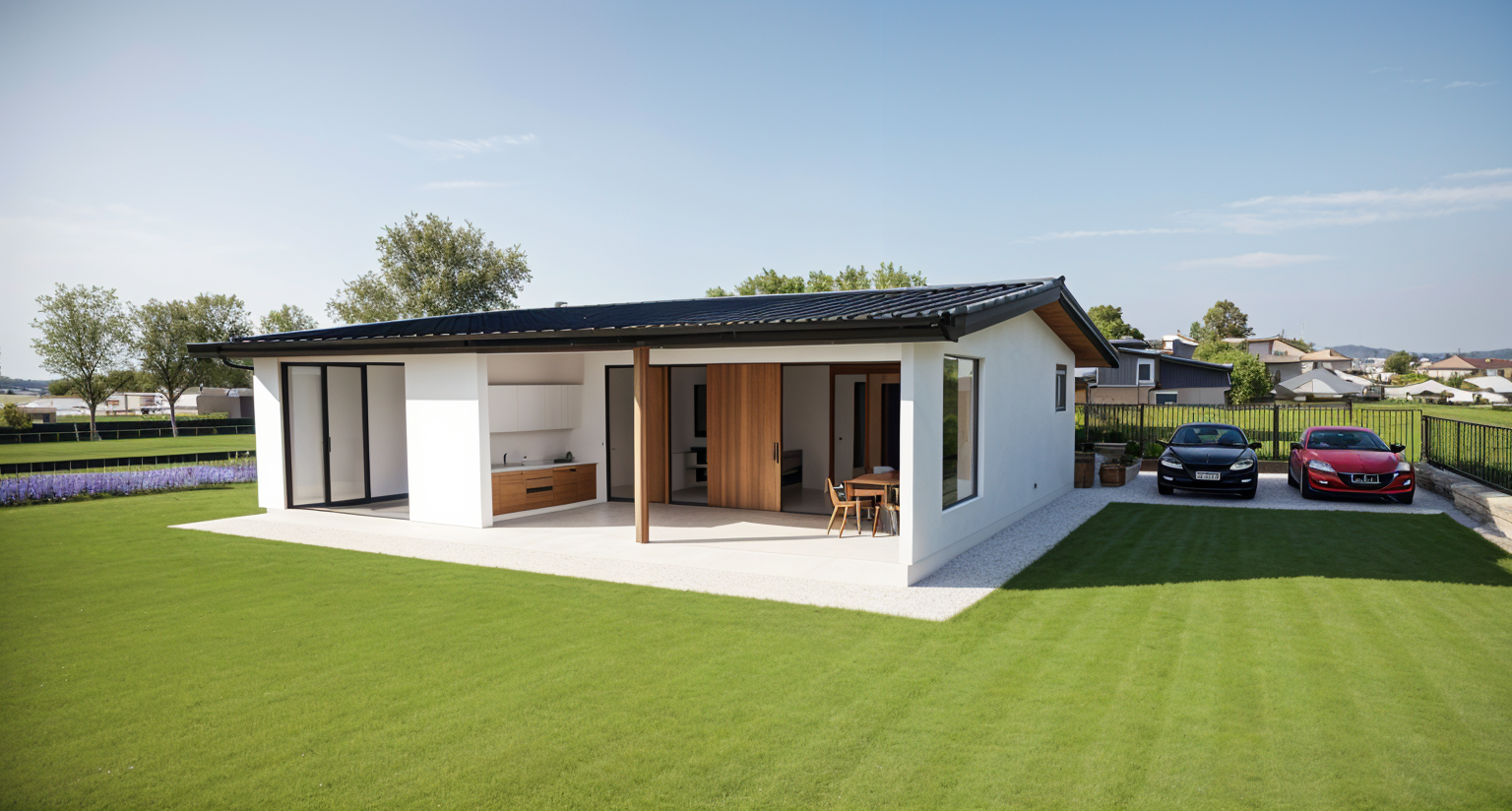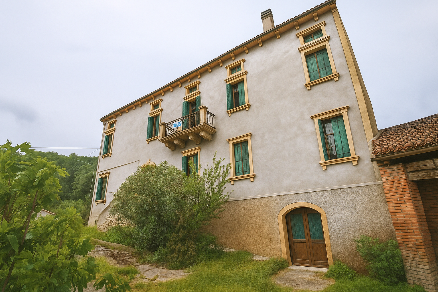 exterior shot stick to the existing builidng structure just improve the finishes render a charming rural villa set against a lush green hillside the villa s walls are beige with a hint of warmth accented by golden window frames the windows have shutters that are a deep rich green the roof is terracotta adding an earthy contrast include the llavender greenery in the foreground with vivid green bushes and grass enhancing the serene natural atmosphere the sky is birght blue capture the peaceful rustic charm and timeless elegance of this tranquil setting