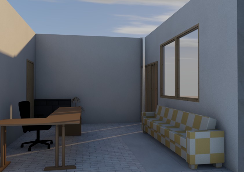 interior design render of there office of general manager luxury blue navy leather sofa with mustard pillows fancy wooden massive angle l shaped desk office chair in alcantara leather wooden bar cart table with rollers at the feet and tv on the north empty wall behind the desk the wall is covered with natural volcanic stone and calacatta marble on its both sides wooden door light grey floor tiles architecture