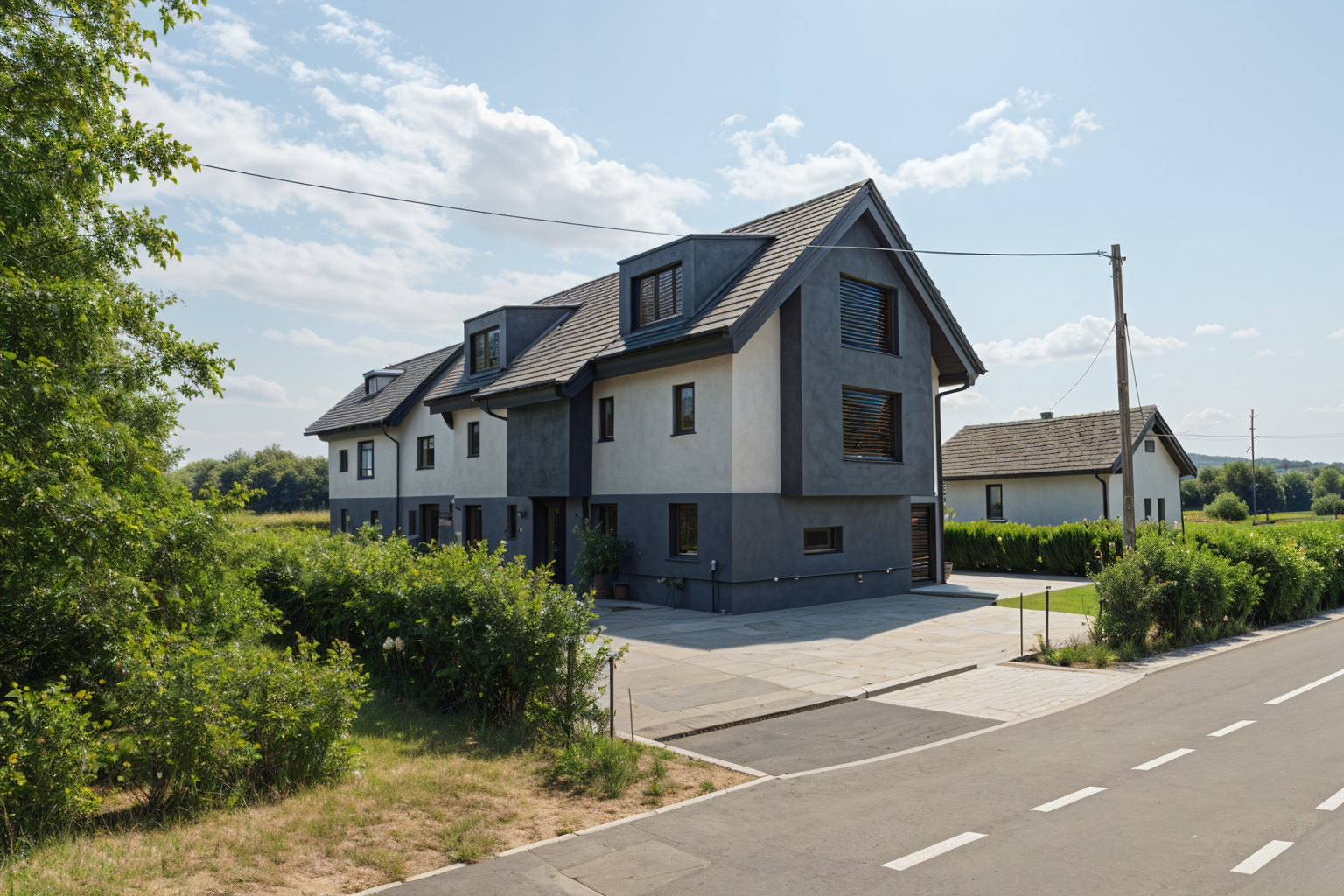 exterior shot remove boxes electricity add trees behind the buildings architecture