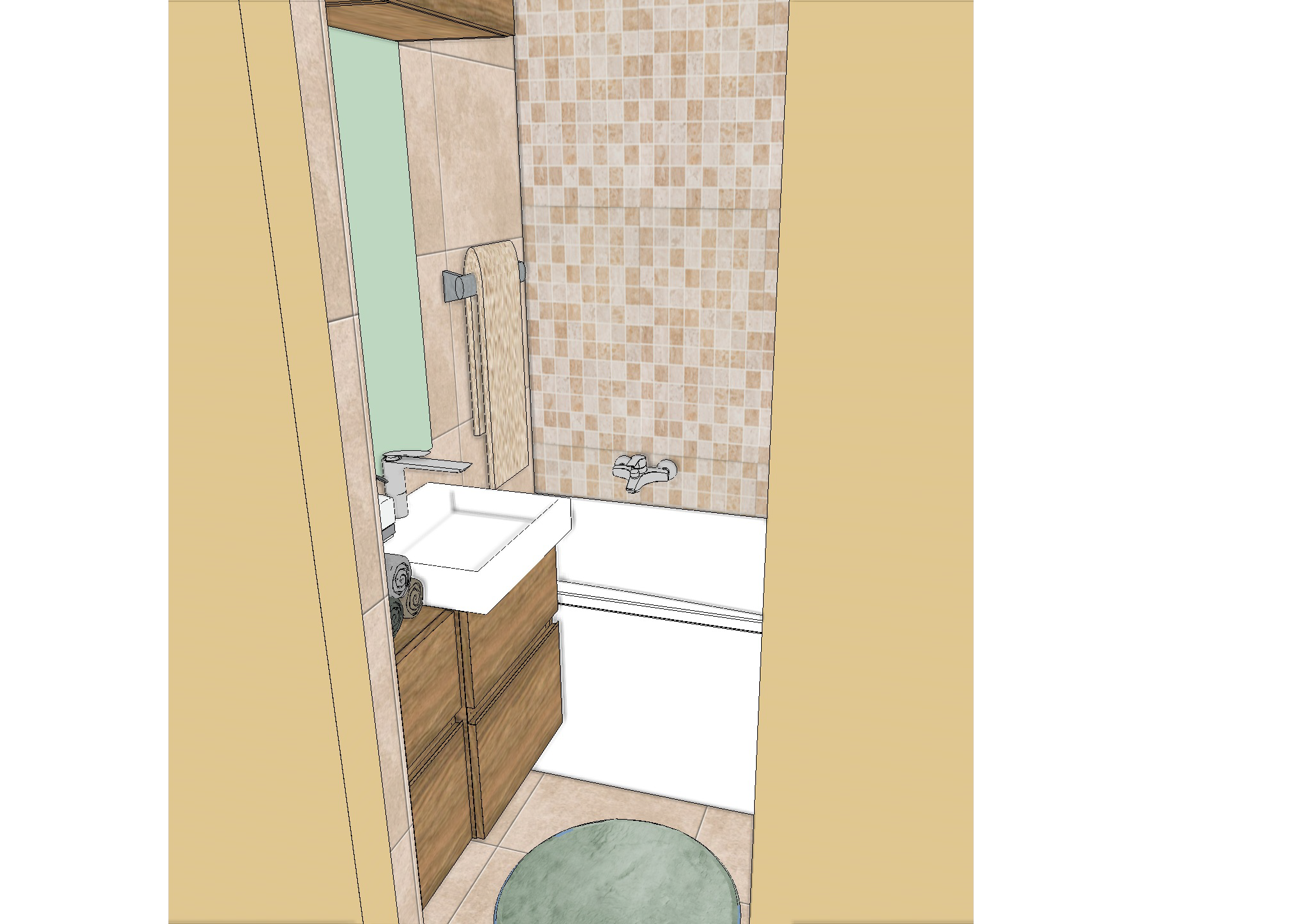 interior shot please show me this cozy bathroom in warm light with pale beige tiles and floor tiles a white sink a bathtub and a radiator above the bathtub there is mosaic tiles in varying shades of beige medium brown wooden furniture a mirror on the wall above the sink and a soft round pale mint colored rug on the floor