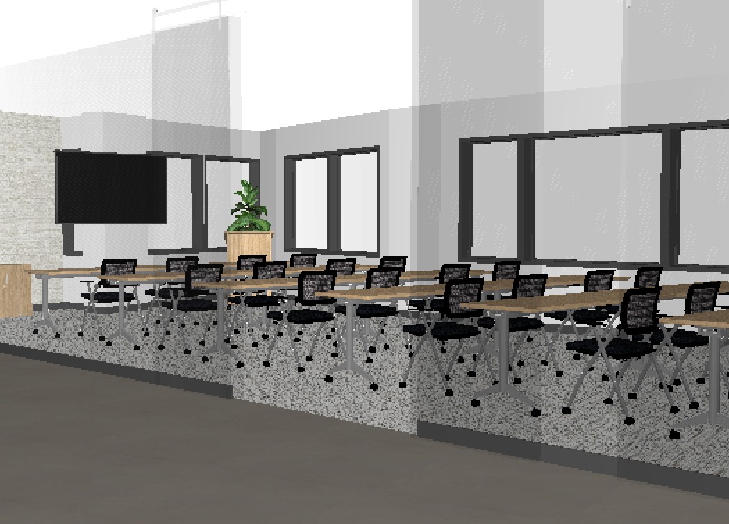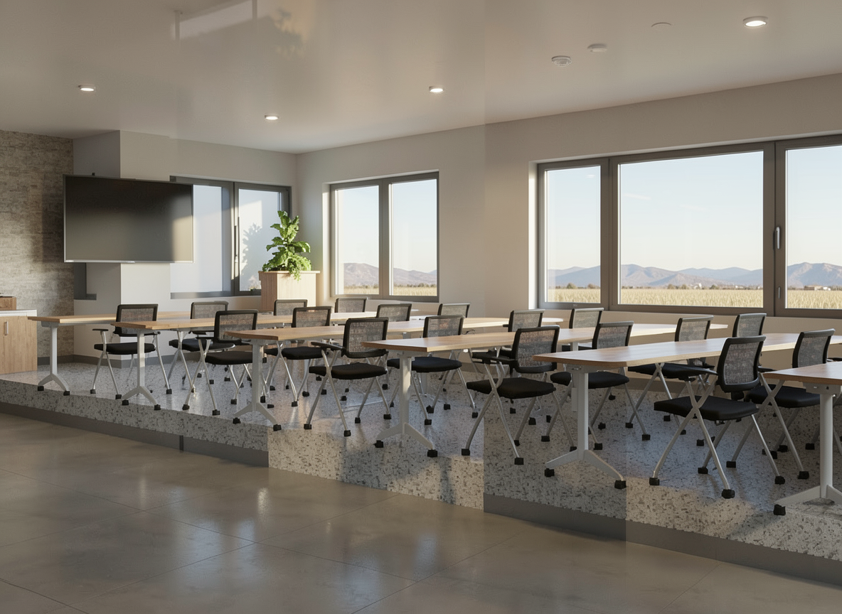render photorealistic keep all finishes and structure as is make ceiling exposed to deck view outside to be field with mountains in far off distance