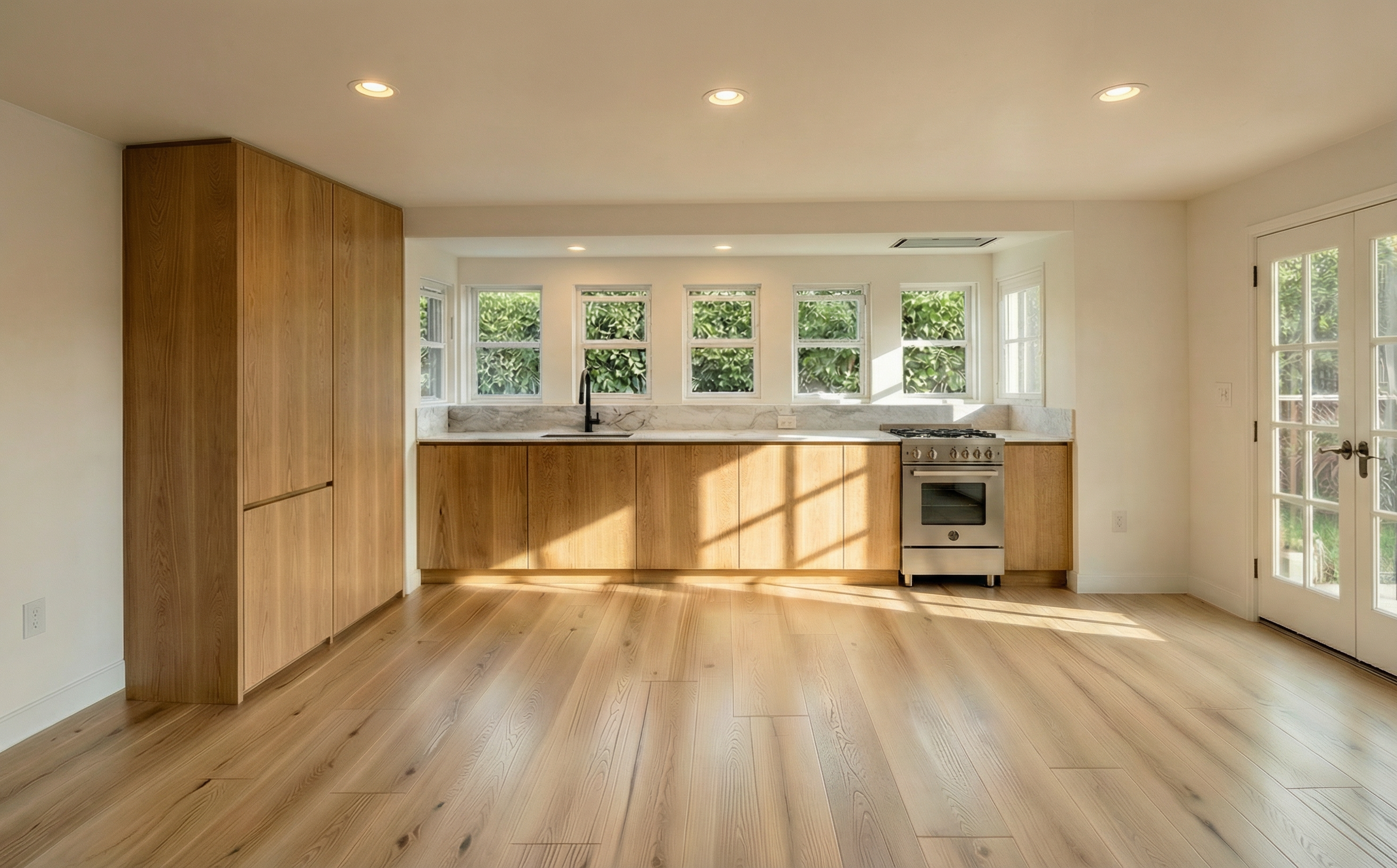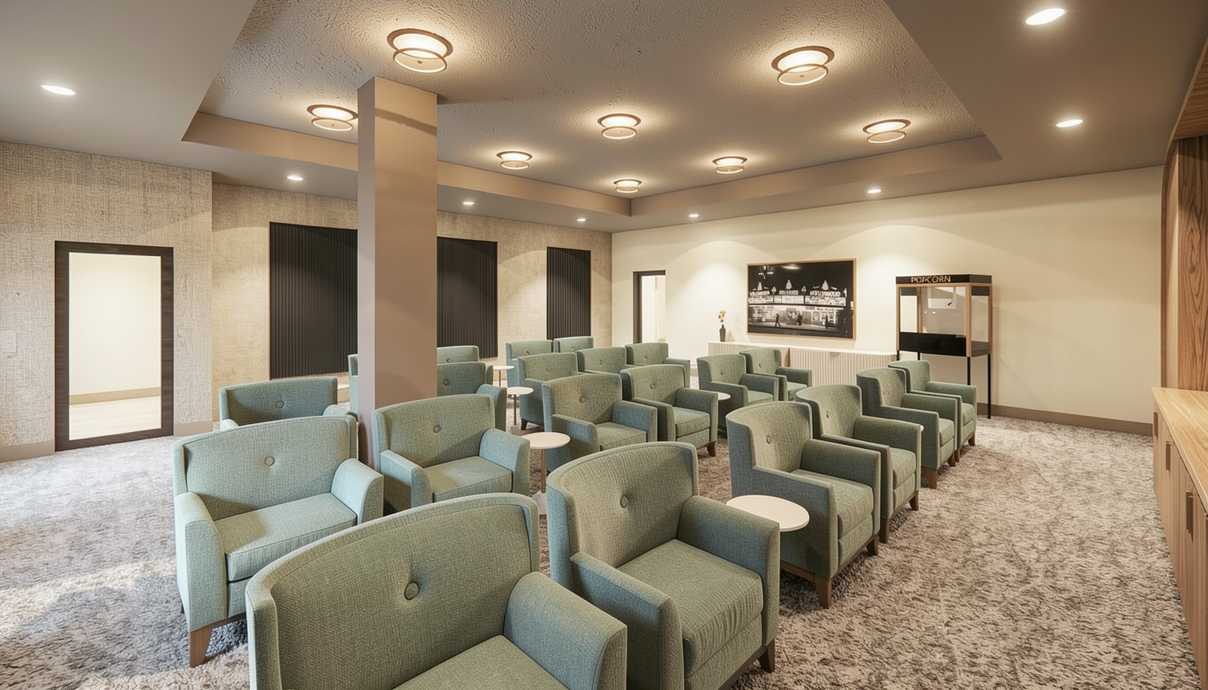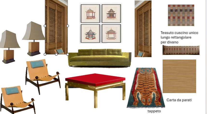 style asian contemporary interior chinese inspired warm minimalism balanced composition high end residential cinematic lighting camera front view eye level symmetrical composition medium wide shot centered on sofa scene description a refined living room with strong chinese inspired elements and a warm immersive atmosphere at the center of the scene a low long olive green sofa is into a custom wooden built in bookshelf niche the niche wraps around the sofa creating an architectural frame the wood is medium dark warm toned inside the bookshelf structure shelves are densely filled with books creating a continuous textured backdrop behind the sofa 4 chinese style framed artworks are placed slightly reduced in size to allow space for books above and around them composition remains balanced not cluttered a long rectangular cushion with a small scale checkered fabric pattern is placed centrally on the sofa side elements on both sides of the bookshelf niche two chinese style table lamps sit on integrated wooden surfaces lamps are on emitting warm ambient light on the far left and right walls wooden lattice screen doors chinese style semi transparent allowing soft natural light to pass through one side slightly open hinting at an exterior beyond materials surfaces walls fully covered in textured wallpaper tone on tone brown as reference wallpaper continues inside the bookshelf niche for continuity floor in warm parquet wood matching wallpaper tones furniture layout in front of the sofa a rectangular red lacquered coffee table with brass legs centered on both sides foreground left and right two low lounge chairs as reference each with a small blue cushion underneath a rectangular rug featuring a tiger motif aligned with the sofa and table lighting warm interior lighting from table lamps soft natural light filtering through wooden screens balanced contrast cozy and cinematic mood keywords chinese contemporary wooden niche built in bookshelf olive green sofa warm tones red lacquer table tiger rug lattice screens ambient lighting symmetrical composition
