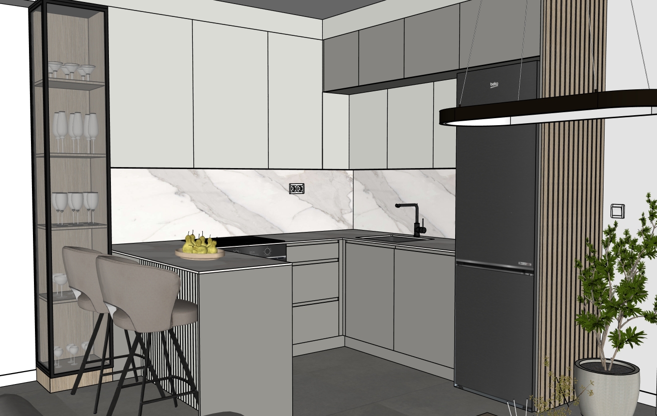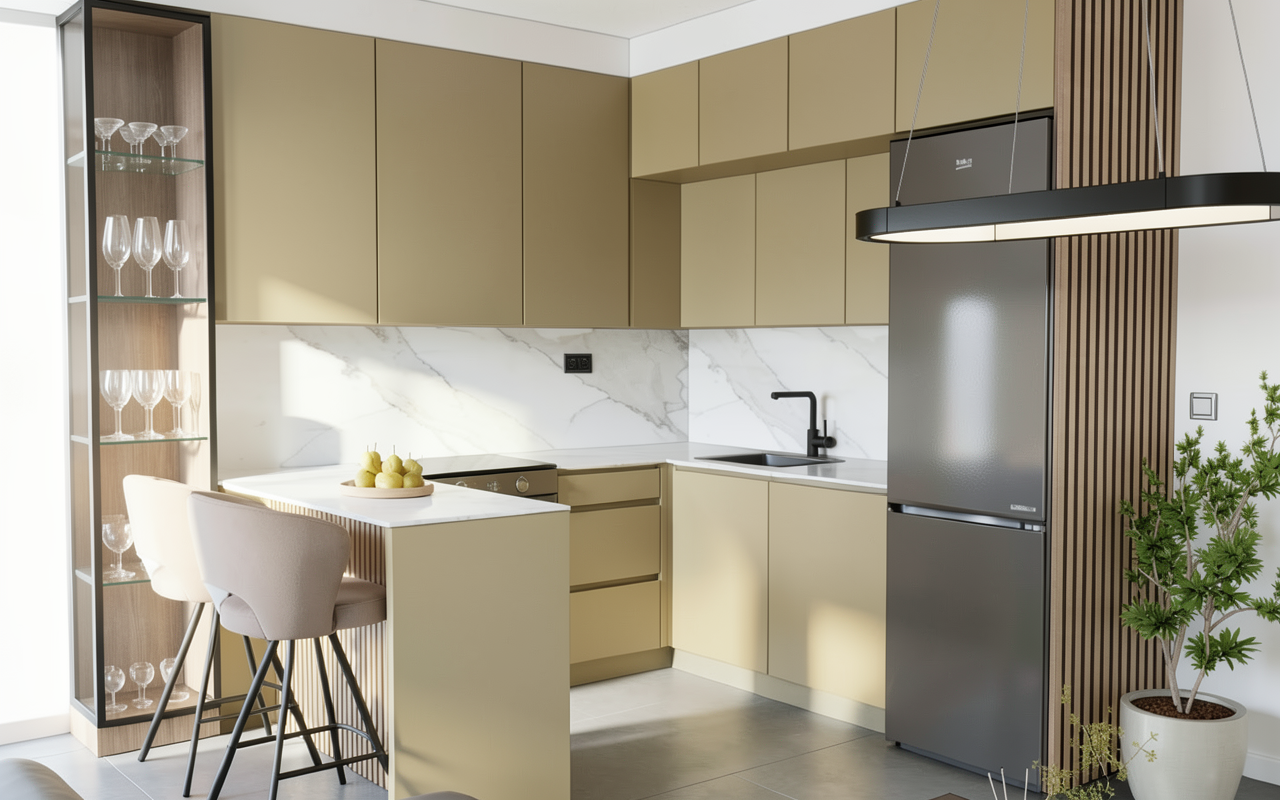 keep the colors textures and materials do not add any new elements keep all shapes unchanged make it realistic with daylight coming from the left side and ambient lighting in the wooden shelf where the glasses are behind the glass front